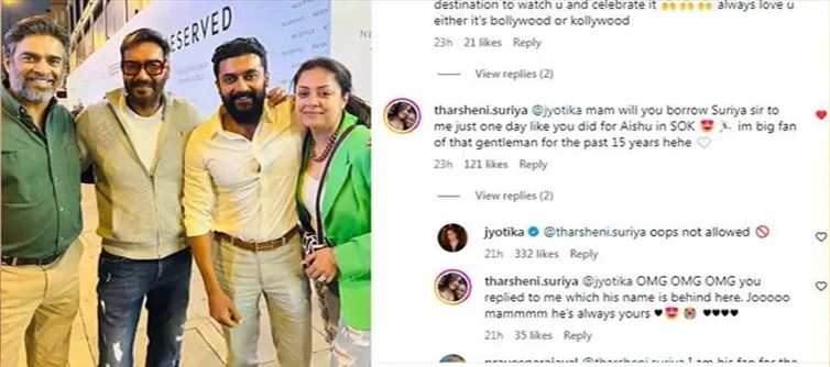 ఇది చూసిన ఓ అభిమాని.. 'జ్యోతిక మేడమ్.. సిల్లును ఒరు కాదల్ సినిమాలో లాగా మీ భర్తను ఒకరోజు నాకు అప్పుగా ఇస్తారా? 15 ఏళ్లుగా ఆ జెంటిల్మెన్కు పెద్ద అభిమానిని' అని కామెంట్ చేసింది. దీనికి జ్యోతిక.. 'అలాంటివేమీ కుదరదమ్మా..' అని రిప్లై ఇచ్చింది. ఆ రిప్లై చూసి అభిమాని ఎగిరి గంతేసింది. 'నేను సూర్యకు ఎంత పెద్ద అభిమానినో మీరసలు ఊహించి ఉండరు. నా పేరులో కూడా అతడి పేరును యాడ్ చేశాను. ఆయనే నా ఫస్ట్ లవ్.. నేను ఆయన్ను ఎంతగానో ప్రేమిస్తున్నాను, ఆరాధిస్తున్నాను. ఈ విషయం ఆయనకు చెప్పండి. అయినా మీరు పంచే ప్రేమ ముందు నాదెంతలెండి' అని రాసుకొచ్చింది.