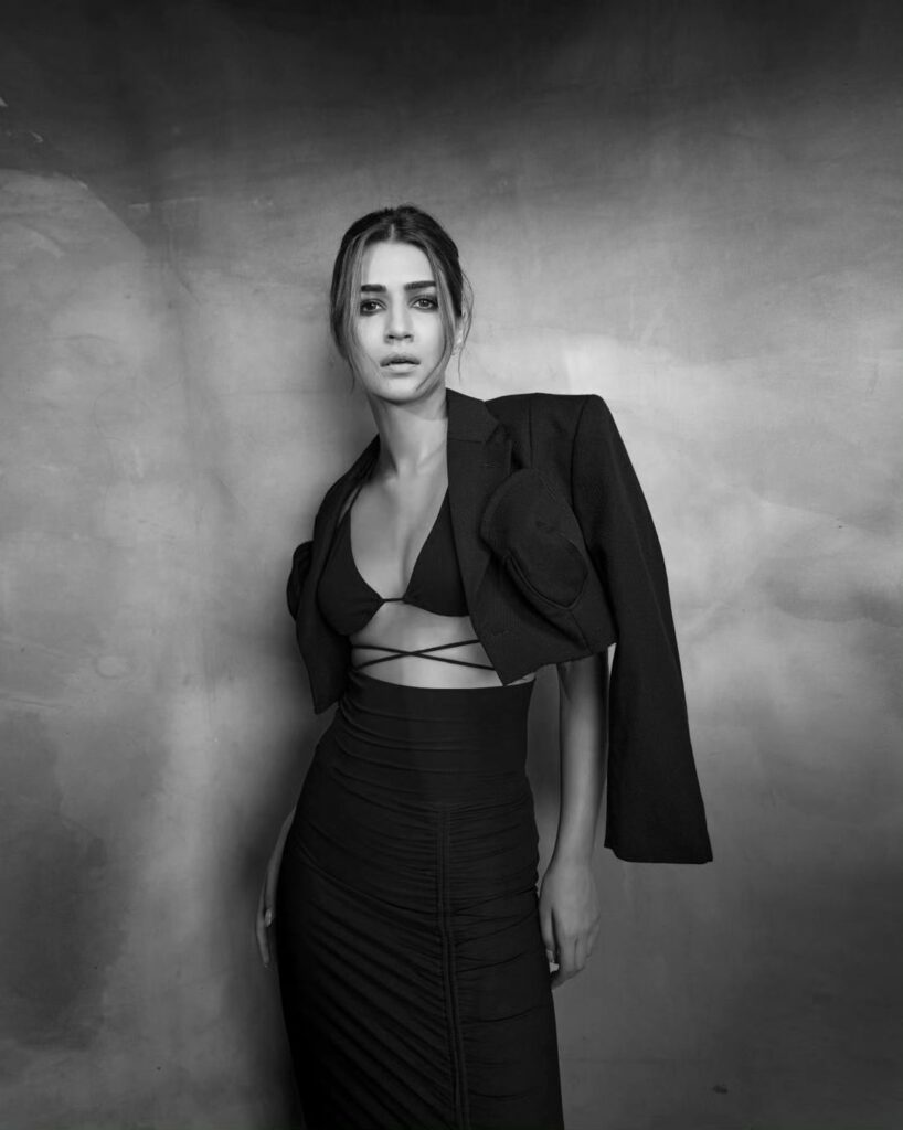 With her recent arrival, kriti sanon turned her attention to wearing an all-black ensemble. The actress chose to go for a stylish and daring style, accentuating her toned form with a ruched skirt and black bralette. Her hair was maintained smooth and fashionable with a high bun, and strappy shoes gave a glamorous touch. An additional layer of refinement provided by the jacket brought the whole look together.