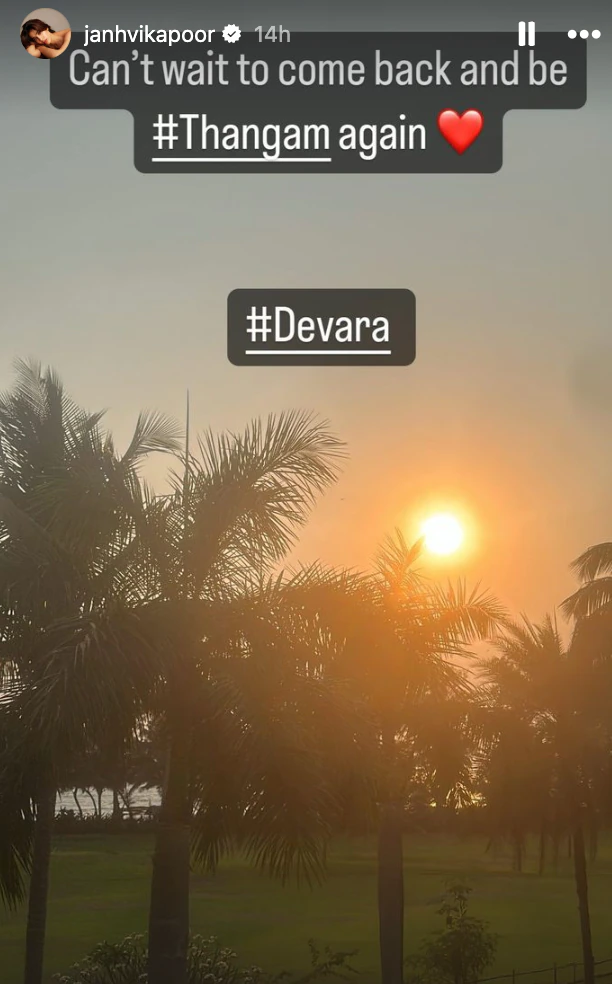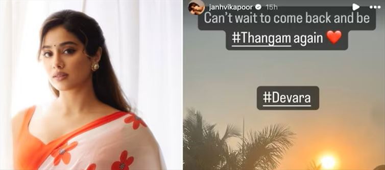 Janhvi Kapoor recently expressed her excitement to return to her part as Thangam in the filming of koratala Siva's "Devara: Part 1," which is now taking place in goa and stars Jr. ntr and Janhvi Kapoor. "Can't wait to come back and be #Thangam again," she said in an instagram post. #Devara (accent)." The role that Kapoor plays in the film is Thangam, a country girl. She joined the project last year and has been shooting nonstop since then.