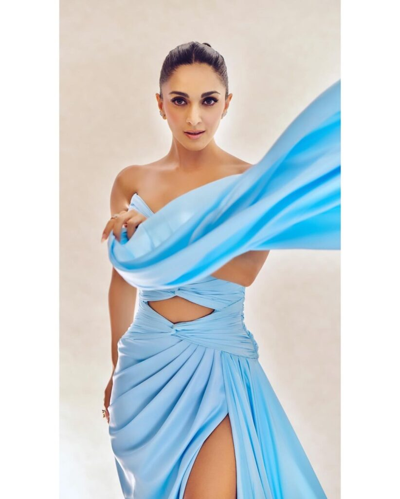 Wearing a garment as blue as the summer sky, kiara advani dazzles like a bright flower. Daring cuts in the dress show hints of sun-kissed flesh, like a tropical flower soaking up the warm sun. Her elegant high bun mirrors the crisp lines of a calla lily, and her brown eyeliner, mascara, and lipstick provide an earthy elegance akin to a hummingbird fluttering among the petals. Subtle earrings that resemble small drops of dew hanging on a leaf finish off the image of subtle glitz.