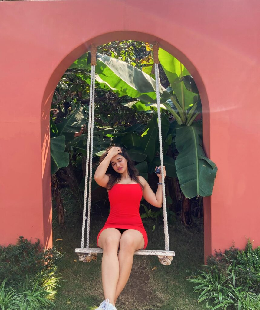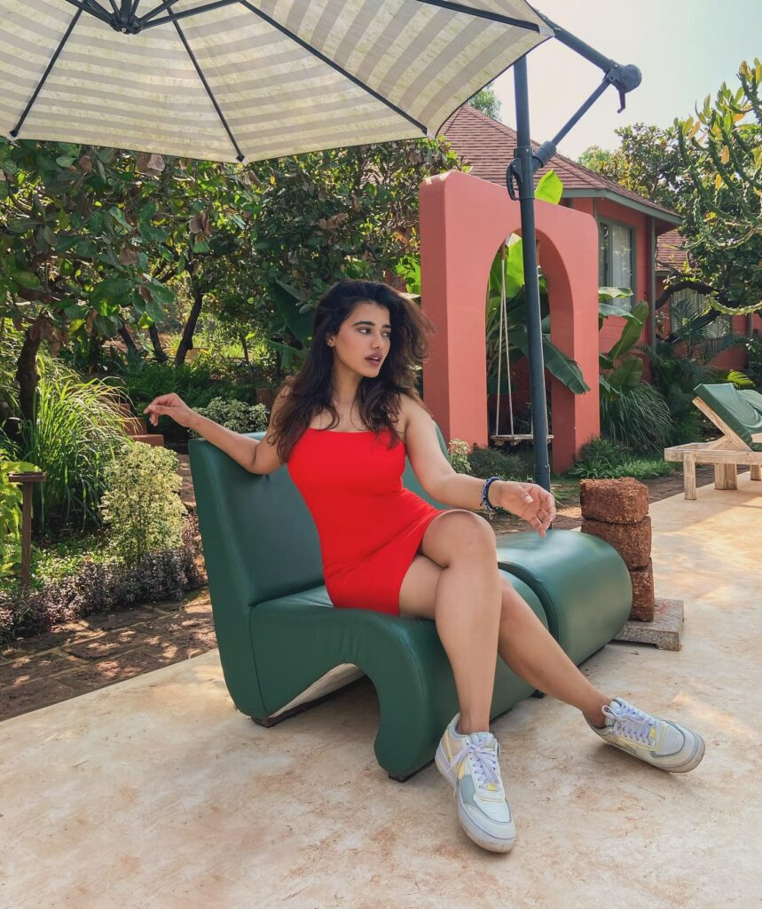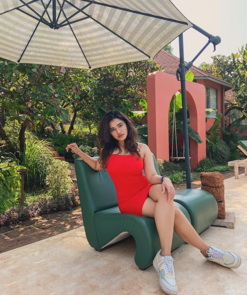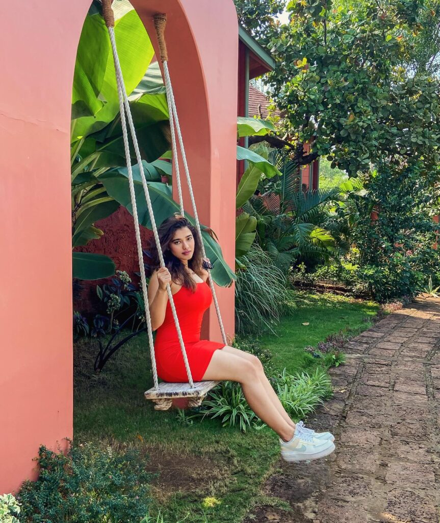 With her most recent photos, ketika sharma is raising the temperature! She looks stunning in a flaming red minidress that flawlessly accentuates her contours. Posing amusingly on a swing, she confidently shows off her well-toned legs. A head of flowing open hair and stylish blue boots finish the ensemble. A hint of pink lipstick gives a splash of colour, which elevates the whole look to effortlessly chic and irresistibly hot.