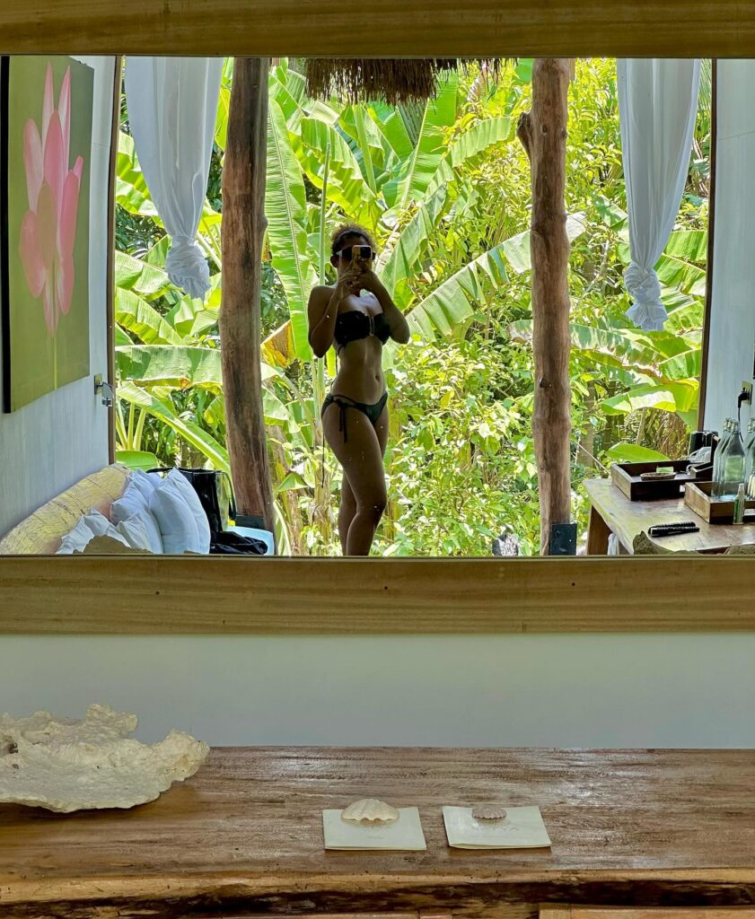 Gnaneswari Kandregula presents herself as a brilliant representation of nature's appeal amid the serene embrace of a beach's immaculate sands. Wearing a sleek black bikini, she stands in the soft beach air, taking a mirror selfie as she captures this moment of dreamy beauty. She easily shows off her toned abs while basking in the sun's golden embrace.