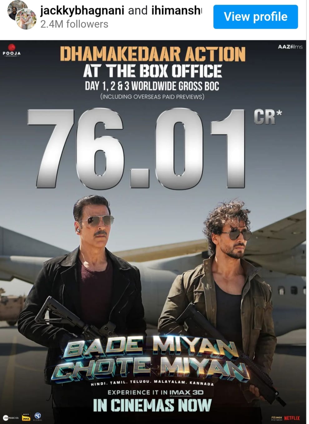 According to a poster posted by producer Jackky Bhagnani on his social media accounts, BMCM has earned Rs 76.01 crore gross globally in only three days, which includes paid premiers and international earnings. Despite being released on Eid, Bade Miyan Chote Miyan maintained its dominance at the box office even on a routine workday.