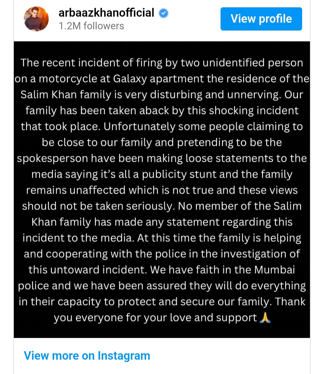 In response to the gun incident, Salman's brother arbaaz khan shared a statement mentioning they are helping the authorities with their investigation.