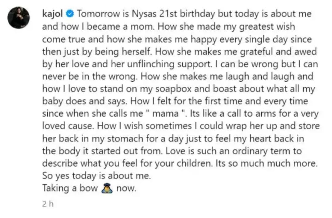 On april 19, 2024, kajol shared a cute childhood photo of her with daughter Nysa on her instagram handle. Along with this, she wrote in the caption, "Tomorrow is Nyasa's 21st birthday, but today is about me and how I became a mother." How she fulfilled my greatest wish and how she has made me happy every day since then, just by being herself. How she makes me grateful and surprises me with her love and unwavering support.