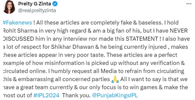Preity Zinta further wrote, 'I respect rohit sharma very much and I am also his big fan. But, I did not give any such interview. Never gave such a statement. I respect shikhar dhawan a lot. At present, he is injured and it is very bad to see such articles coming at such a time. This article is an example of misinformation, which was published without any facts and is going viral on social media.