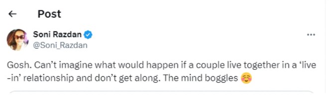 This statement by mukesh khanna has sparked further debate on social perceptions of live-in relationships. Actress soni razdan has given a sharp reaction to this statement of Mukesh. He has strongly criticized him by sharing a post on his social media. soni razdan shared the post on X (formerly Twitter) and wrote, 'Oh my God. Can't even imagine what would happen if a couple lives together in a live-in relationship and is not together. The mind gets confused.