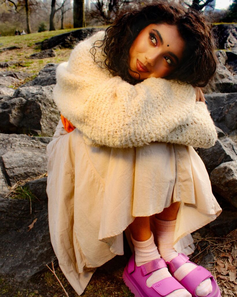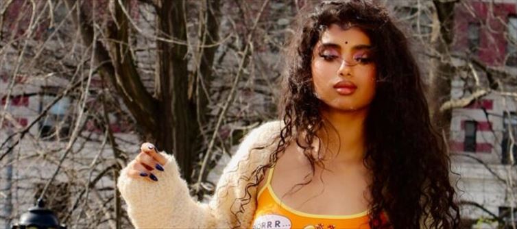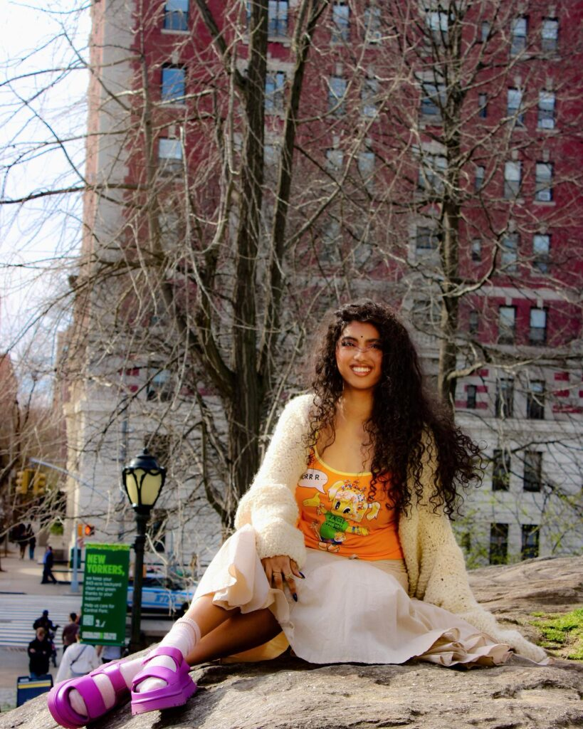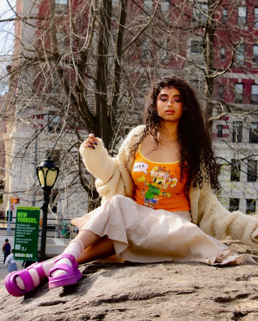 Seated on a rock, Avantika can be seen in the photos wearing a skirt, a cosy sweater and a bright orange cartoon camisole. Her striking purple slip-ons shoes complete the ensemble. Avantika looks stunningly bold but understated with her makeup. She makes a statement by wearing red eyeliner and lipstick. A little black bindi gives a traditional touch. She chooses for delicate cheek makeup and winged black mascara to draw attention to her curly hair and counterbalance the aggressive accents. The entire appearance is gorgeous and perfectly captures Avantika's own style.