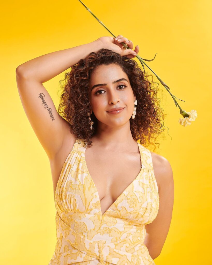 Sanya Malhotra's most recent photo is a significant source of style inspiration! With her gorgeous low-neck gown on, Sanya exudes grace and elegance. Her legs appear longer thanks to the matching shoes and the dress's flawless contouring. Her wavy hair gives a romantic touch, and her earrings' floral accent completes the ensemble. The flower she is holding gives the otherwise elegant outfit a dash of humour. With this outfit, Sanya is undoubtedly setting some major fashion aspirations!