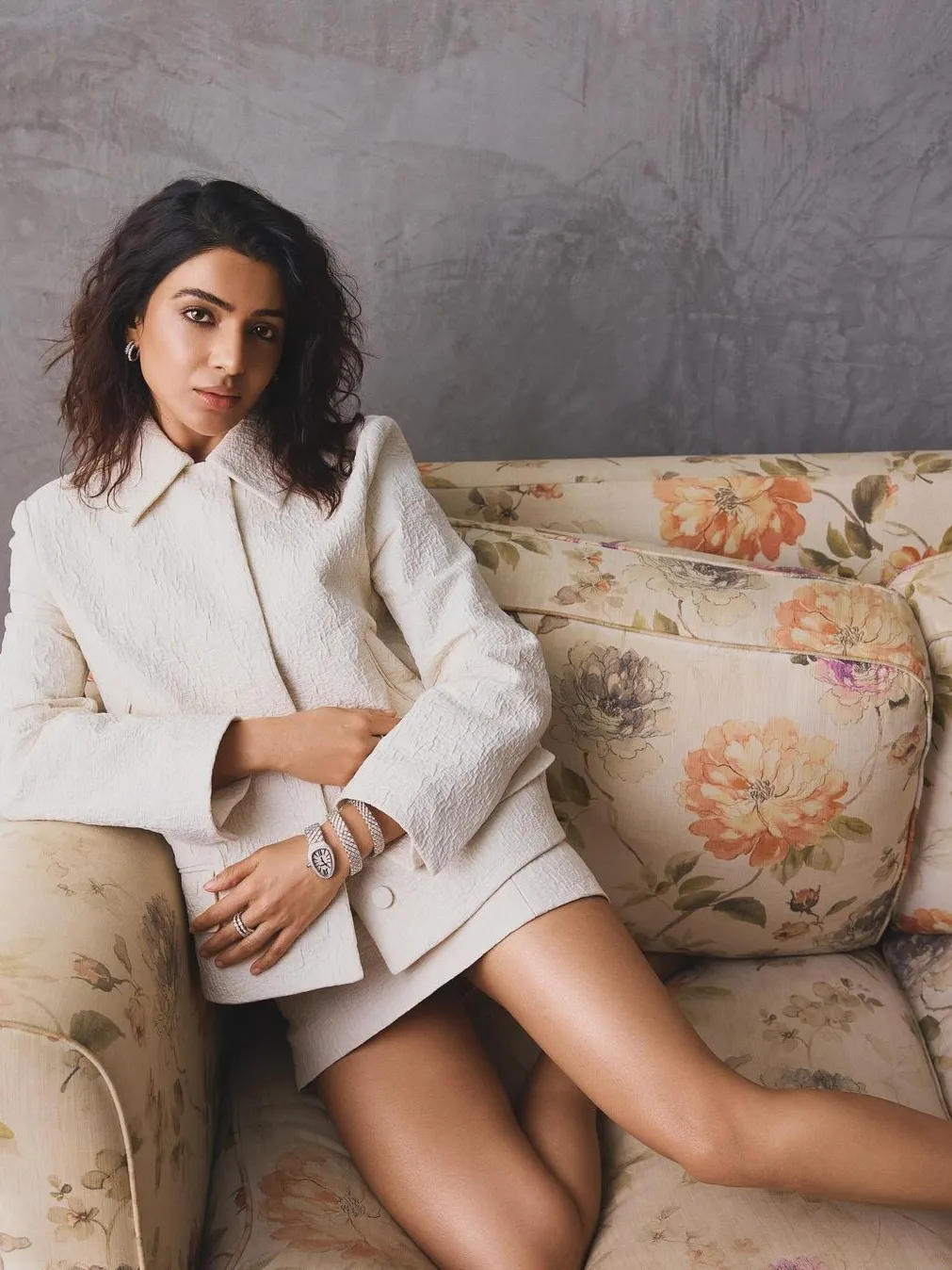 Style queen samantha Ruth Prabhu is back, and this time, her appearance will blow you away! samantha just shared some photos on her social media, and it's safe to say that they give off some boss babe vibes. samantha exudes flair and confidence while wearing a gorgeous white Gucci powersuit and matching shorts. Bulgari jewellery, such as a watch, earrings, and finger rings, further elevates the ensemble and lends an air of luxury.