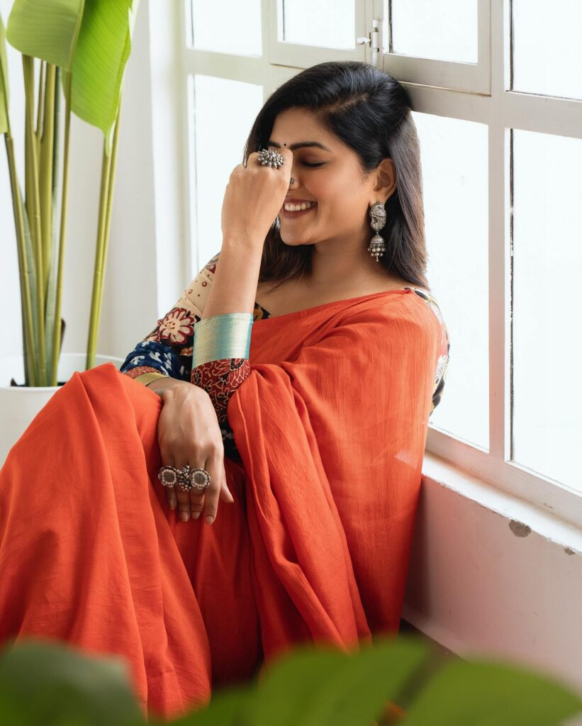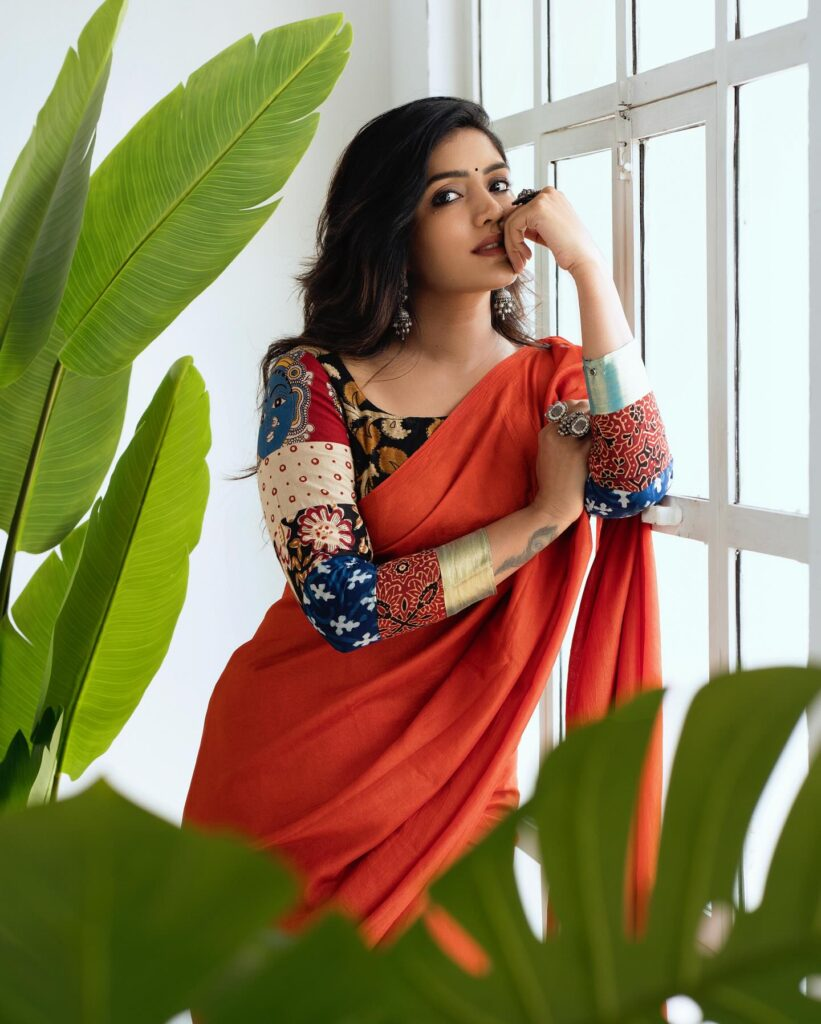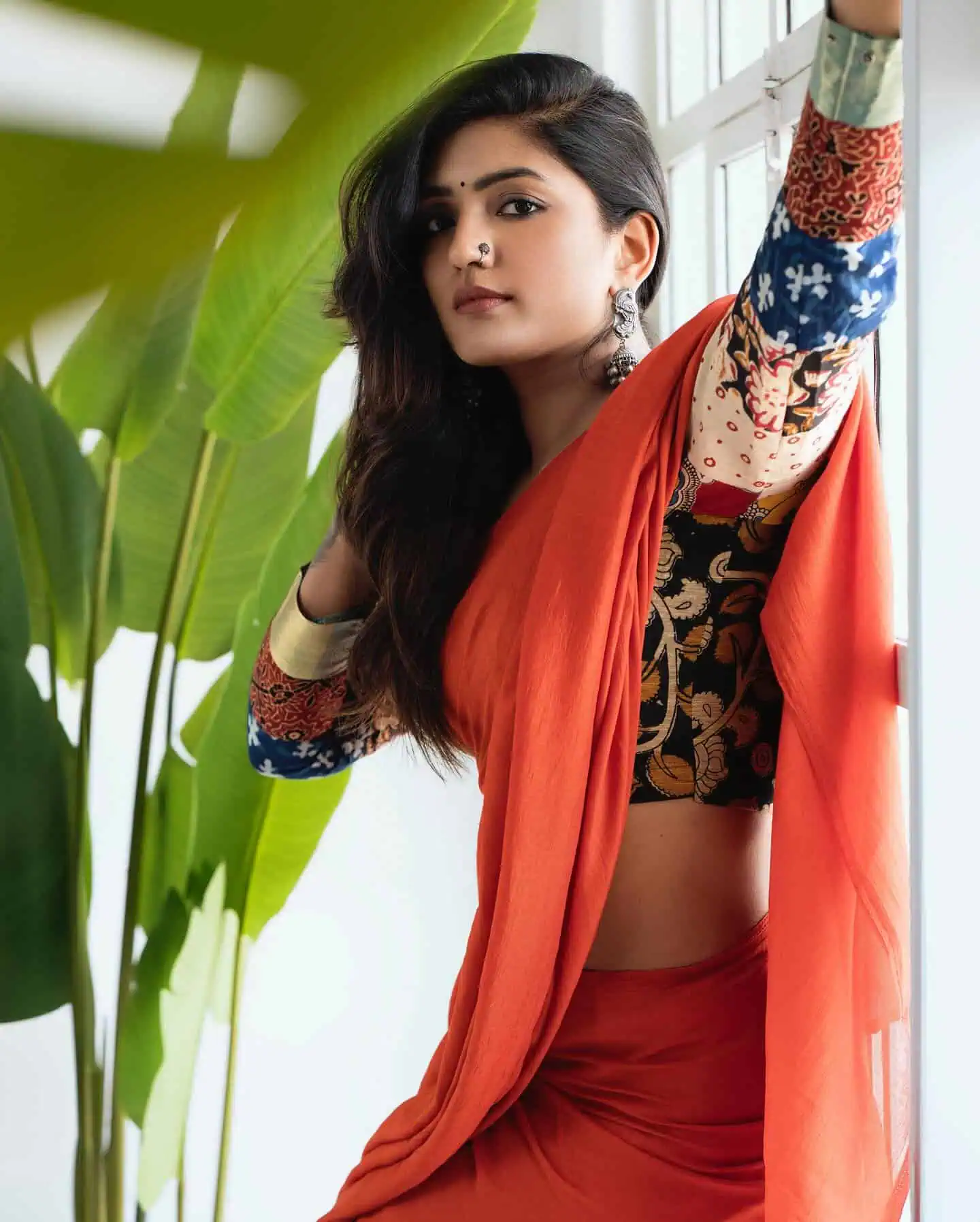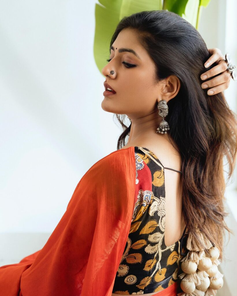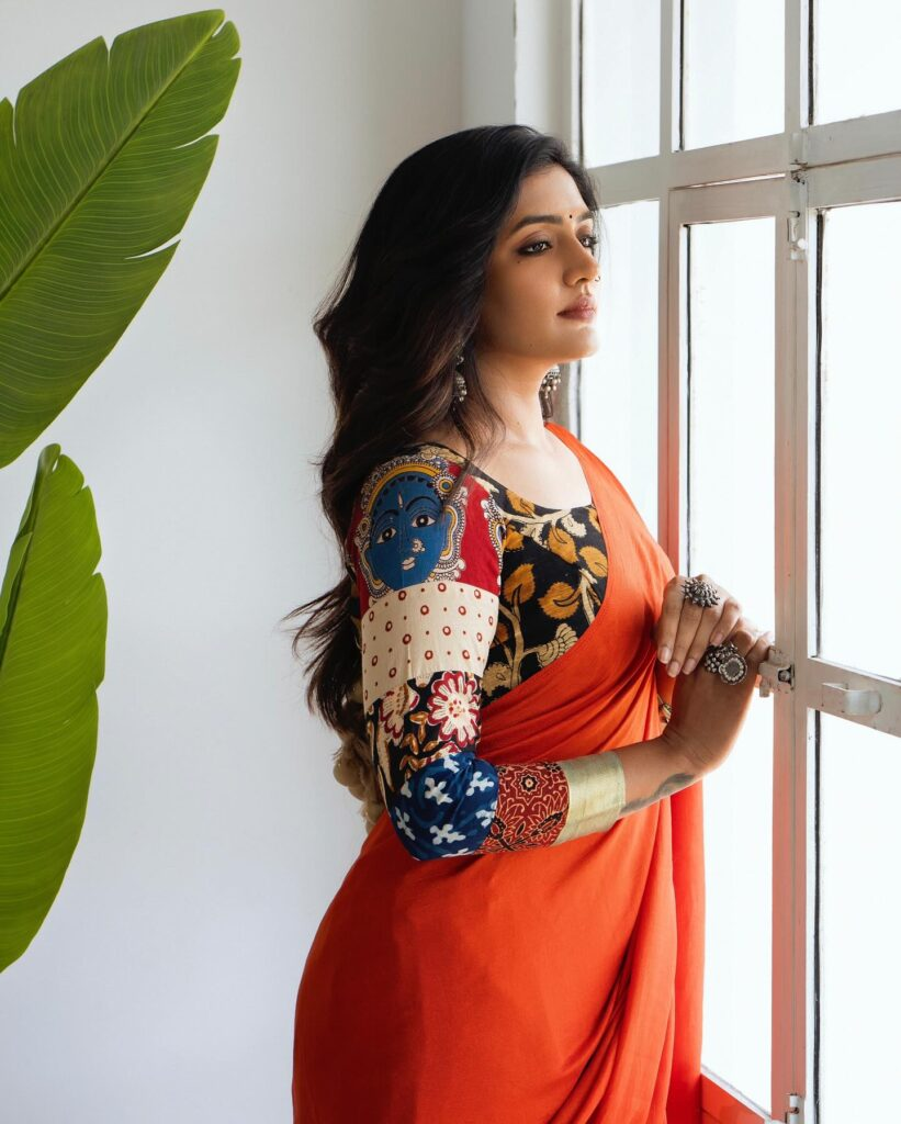 Sunshine is emanating from eesha rebba in her most recent photo shoot! The actress wore a vivid orange saree that wonderfully fitted her contours instead of the typical pastel colours. However, it was the blouse that truly stole the show. The long sleeves featured elaborate motifs in a riot of colours that gave a whimsical touch to the sophisticated drape. With a seductive nose ring, jaw-enhancing jhumkas, and a crimson lipstick that contrasted with her glossy makeup, eesha further amplified her glam factor.