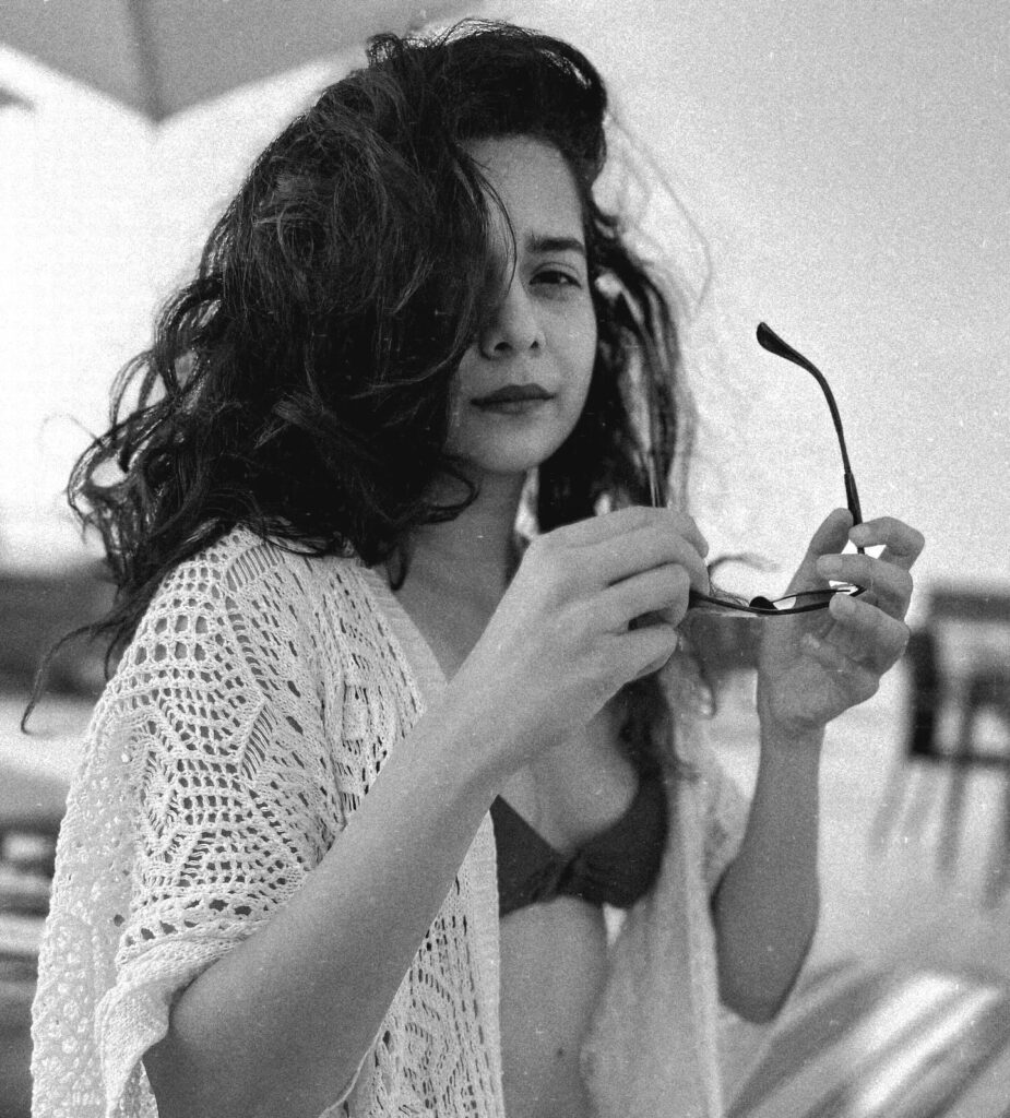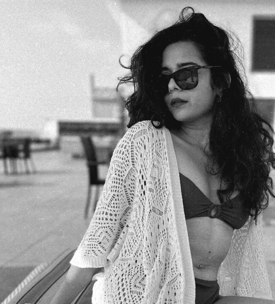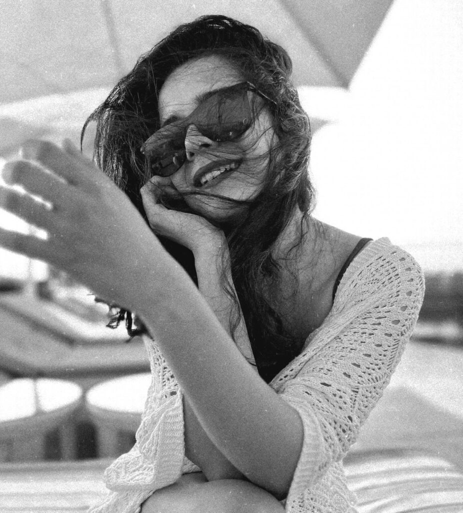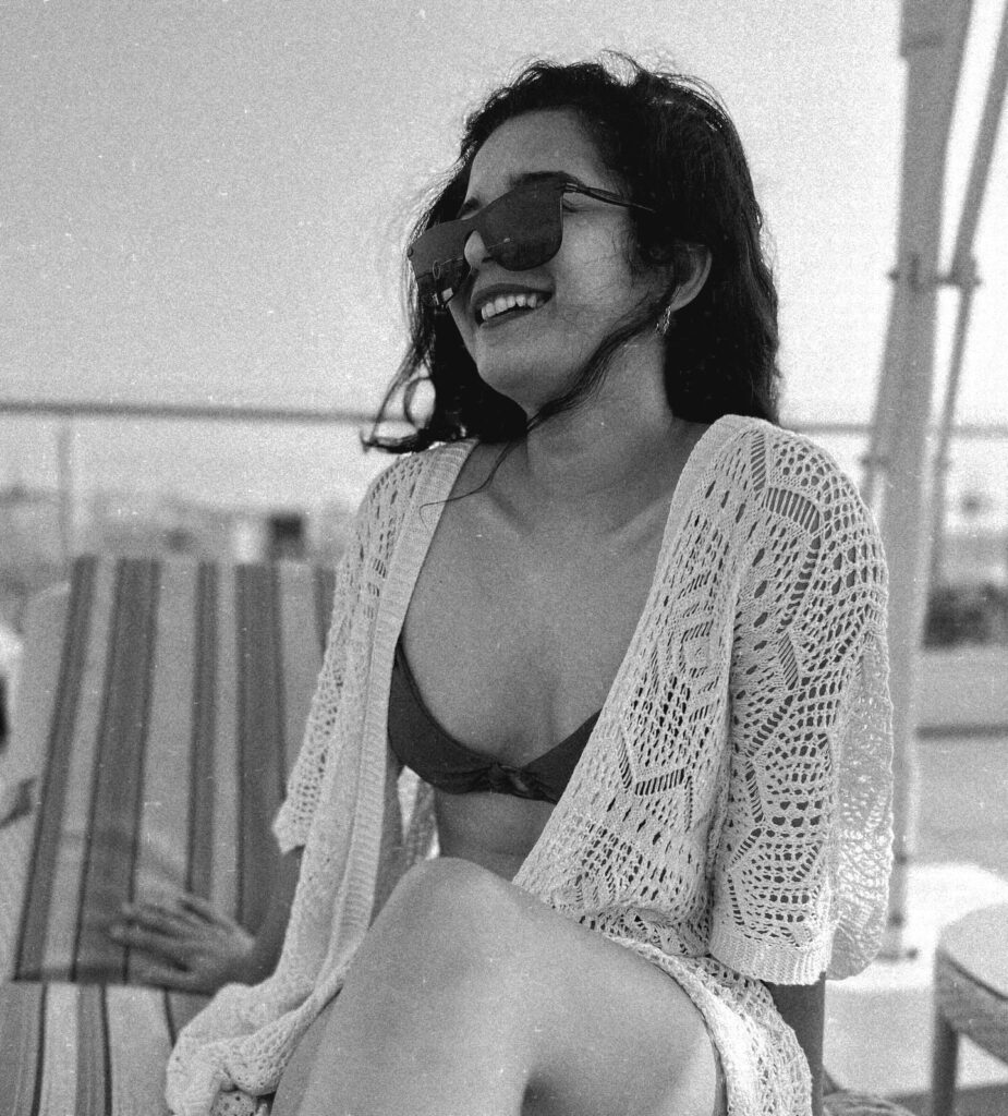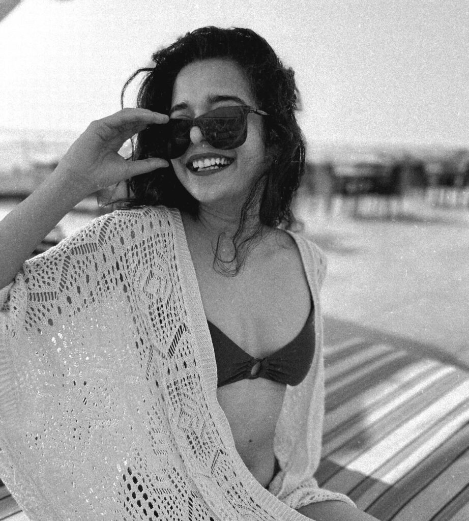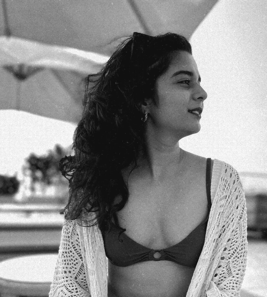 With an eye-catching bikini and a chic netted shrug, Mithila playfully rides the waves. Her toned abs steal the show, but her goggles lend a playful touch to the ensemble. The images are given a timeless elegance by the black and white filter, which perfectly captures the spirit of a carefree summer day. Mithila's contagious smile and dazzling enthusiasm are so endearing that they make you want to have some fun on the beach yourself!