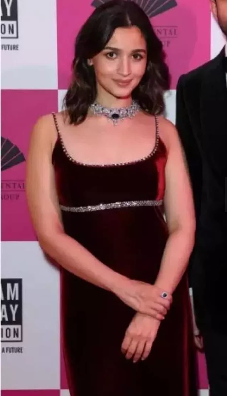 In march 2024, alia bhatt hosted an event 'Hope Gala 2024' in london for the indian NGO 'Salaam Bombay' (which cares for underprivileged children). For the first day of the event, the actress chose a wine art velvet gown, which had strappy sleeves, a deep neckline, and stone embellishments on the border. Soft makeup, wavy tresses, and a sapphire neckpiece completed her look. According to several reports, Alia's sapphire lace neckpiece was from the international brand 'Bvlgari' and is worth around Rs 20 crore.