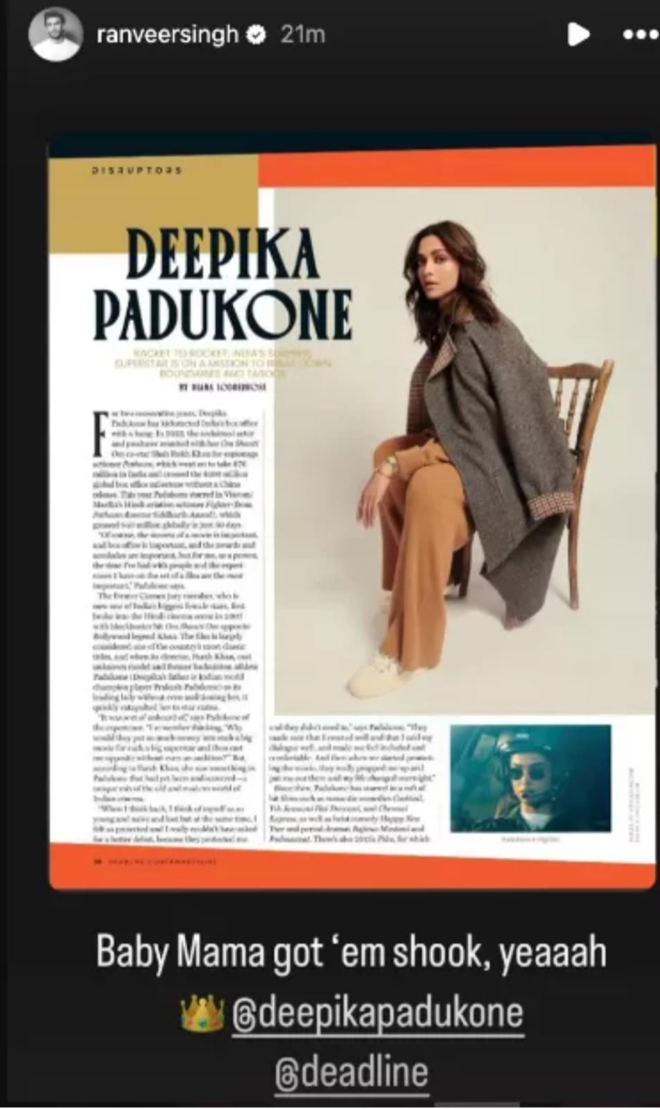 Amidst everything, Deepika Padukone's doting husband, Ranveer Singh can be seen being her loudest cheerleader and playing a huge part to be with her during the actress' pregnancy phase. Ranveer took to his IG handle and shared a screenshot of an article from Deadline's Global Disruptors 2024 list featuring the pregnant actress. For the unversed, deepika became the first indian celebrity to feature on the list. Thus, sharing them, Ranveer gave a cute shoutout to deepika and mentioned her nickname. Atop it, Ranveer wrote:
