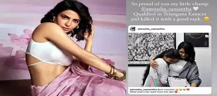ఇదిలా ఉంటే తాజాగా ఇన్ స్టా గ్రామ్ స్టోరీస్ లో ఒక ఆసక్తికరమైన పోస్ట్ పెట్టిందీ అందాల తార.ఇటీవల రిలీజైన తెలంగాణ ఎంసెట్‌ ఫలితాల్లో సమంత అభిమాని మంచి ర్యాంకు సాధించింది. తన డైహార్డ్‌ ఫ్యాన్‌ అయిన అమ్మాయి ఎంసెట్‌ లో మంచి ర్యాంక్‌ సాధించడంతో తెగ ఖుషి అవుతోంది సమంత. ఈ సందర్భంగా సోషల్ మీడియా వేదికగా ఆ టాప్ ర్యాంకర్ కు అభినందనలు తెలిపిందీ ముద్దుగుమ్మ. తన ఇన్‌స్టాగ్రామ్‌ స్టోరీస్‌లో తన డై హార్డ్ ఫ్యాన్ తో దిగిన ఫోటోను షేర్ చేసిన సమంత ' నిన్ను చూస్తుంటే చాలా గర్వంగా ఉంది లిటిల్ ఛాంపియన్' అంటూ రాసుకొచ్చింది.ప్రస్తుతం సామ్ షేర్ చేసిన పోస్ట్ సోషల్ మీడియాలో వైరల్ గా మారింది. ఎంసెట్ ఫలితాల్లో మంచి ర్యాంక్ సాధించిన అభిమానిని గుర్తు చేసుకుని మరీ అభినందించిన ఈ అందాల తారపై ప్రశంసలు కురిపిస్తున్నారు అభిమానులు, నెటిజన్లు. కాగా ఇటీవల సమంత మార్ఫింగ్ బారిన పడింది. దీనిని నిజమనుకుని చాలా మంది సామ్ ను ట్రోలింగ్ చేశారు. తీరా అది ఓ నెటిజన్ చేసిన చిల్లర పని అని తెలిసింది. కాగా ఇటీవల తన పుట్టిన రోజు సందర్భంగా 'మా ఇంటి బంగారం' చిత్రాన్ని ప్రకటించింది సమంత. అలాగే పోస్టర్‌ను కూడా రిలీజ్ చేశారు.ఇక వరుణ్ ధావన్‌తో సమంత నటించిన 'హనీ బాని' వెబ్ సిరీస్ కూడా రిలీజ్ కు సిద్ధంగా ఉంది.