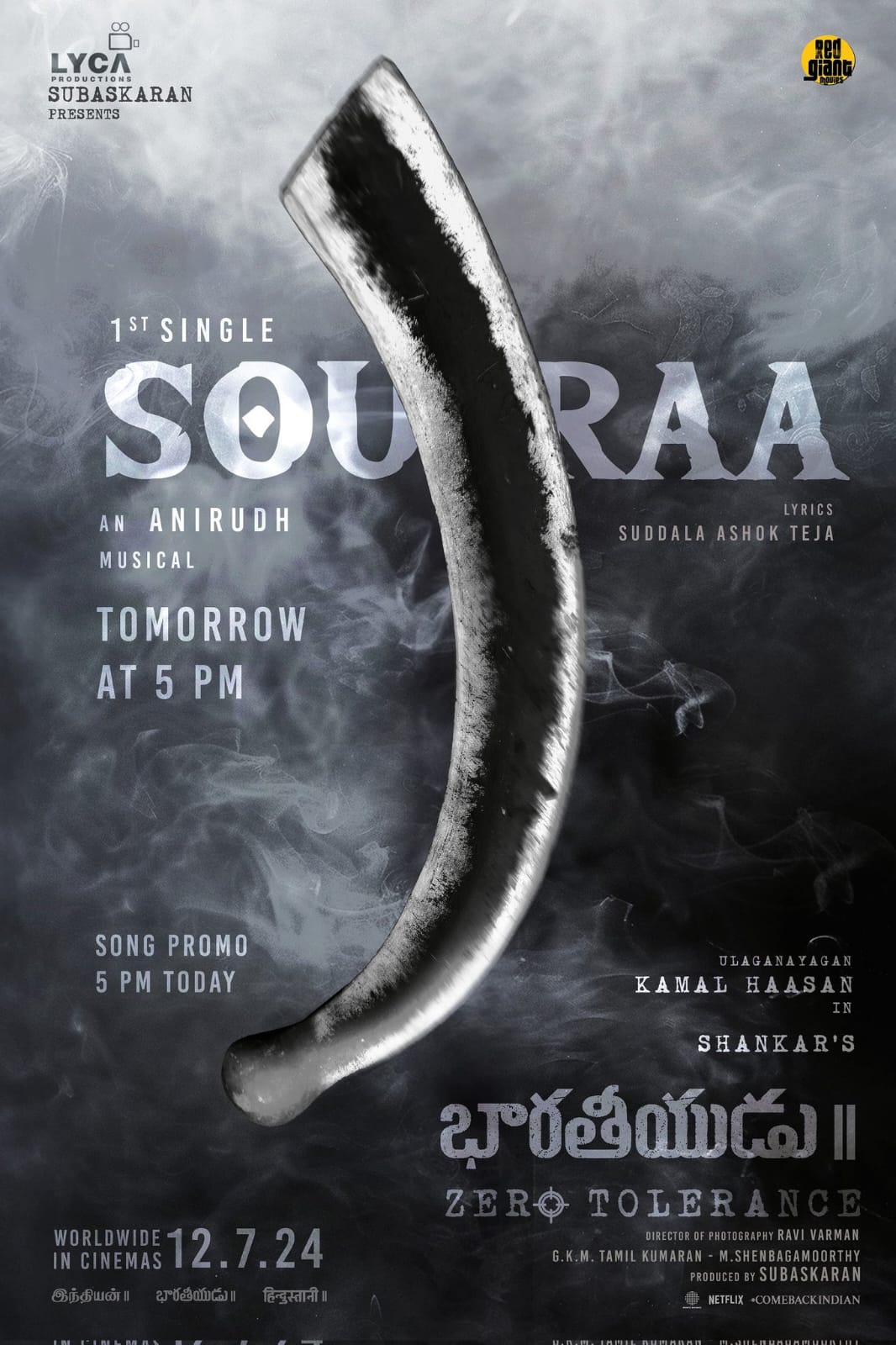 ఈ సినిమాను లైకా ప్రొడక్షన్స్ బ్యానర్ వారు నిర్మిస్తున్నారు. ఇకపోతే ఈ సినిమాను తెలుగు లో భారతీయుడు 2 అనే పేరుతో విడుదల చేయనున్నారు. ఈ మూవీ ని తమిళ్ , తెలుగు , హిందీ భాషలలో జూన్ 12 వ తేదీన విడుదల చేయనున్నట్లు అలాగే ఈ సినిమా లోని మొదటి పాటను మే 22 వ తేదీన విడుదల చేయనున్నట్లు మేకర్స్ అధికారికంగా ప్రకటించారు. ఇక తాజాగా ఈ మూవీ బృందం వారు ఈ సినిమా యొక్క మొదటి పాట యొక్క ప్రోమో ను మరియు ఈ సినిమా యొక్క టోటల్ లిరికల్ వీడియోను ఏ సమయానికి విడుదల చేయబోతున్నాం అనే విషయాన్ని అధికారికంగా ప్రకటిస్తూ ఓ పోస్టర్ ను తాజాగా విడుదల చేశారు.
