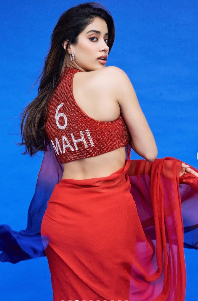 For the trailer launch of 'Mr & Mrs. Mahi', Janhvi donned a quirky red and blue saree. It had a sequined bodice and a sporty blouse with jersey number 6 at the back. ‘Mahi’ was also written on her blouse.