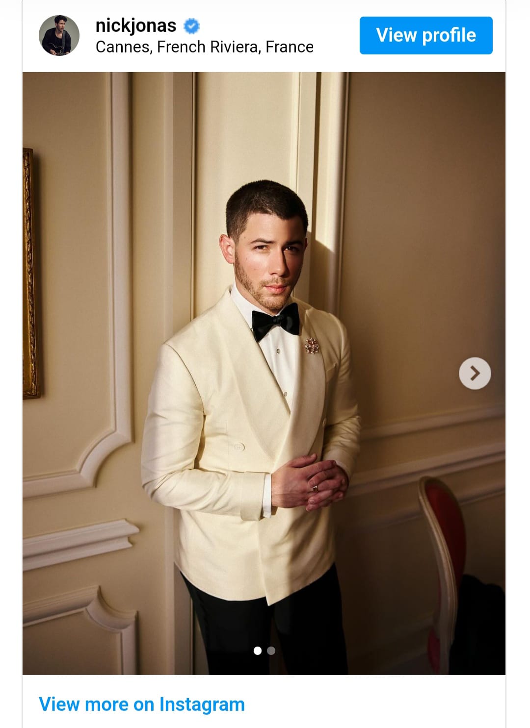 Nick took to instagram to share pictures of himself striking various poses in his hotel room in Cannes. For the event, he sported a white shirt, cream jacket, black pants, and a bow tie, showcasing his stylish ensemble to his followers.