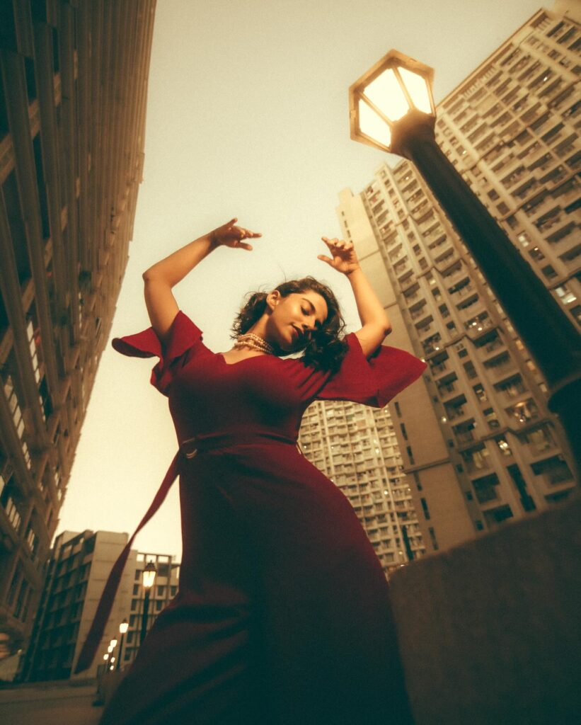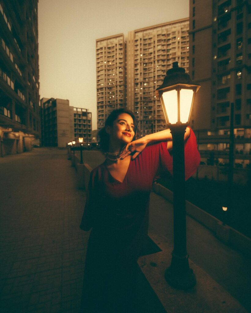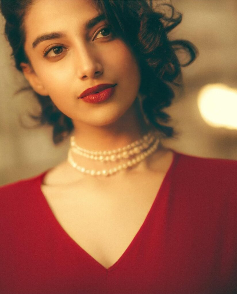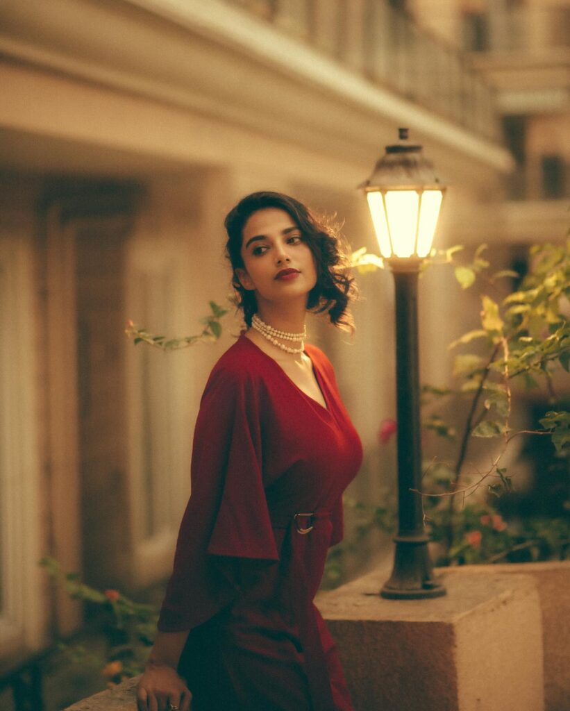 Meenakshi's makeup looks great with her vivid clothing. Glossy lips and bright red eyeliner create an eye-catching appearance that suits her flaming red outfit. With her hair in flowing waves, she exudes confidence and effortless beauty. The text, "In my La La Land," nicely portrays the photo's dreamy and elegant mood. We can only imagine how happy Meenakshi must be!