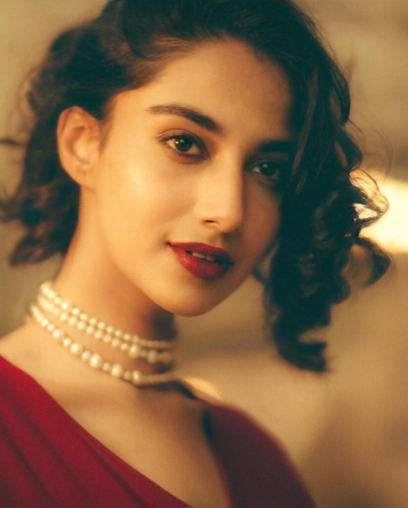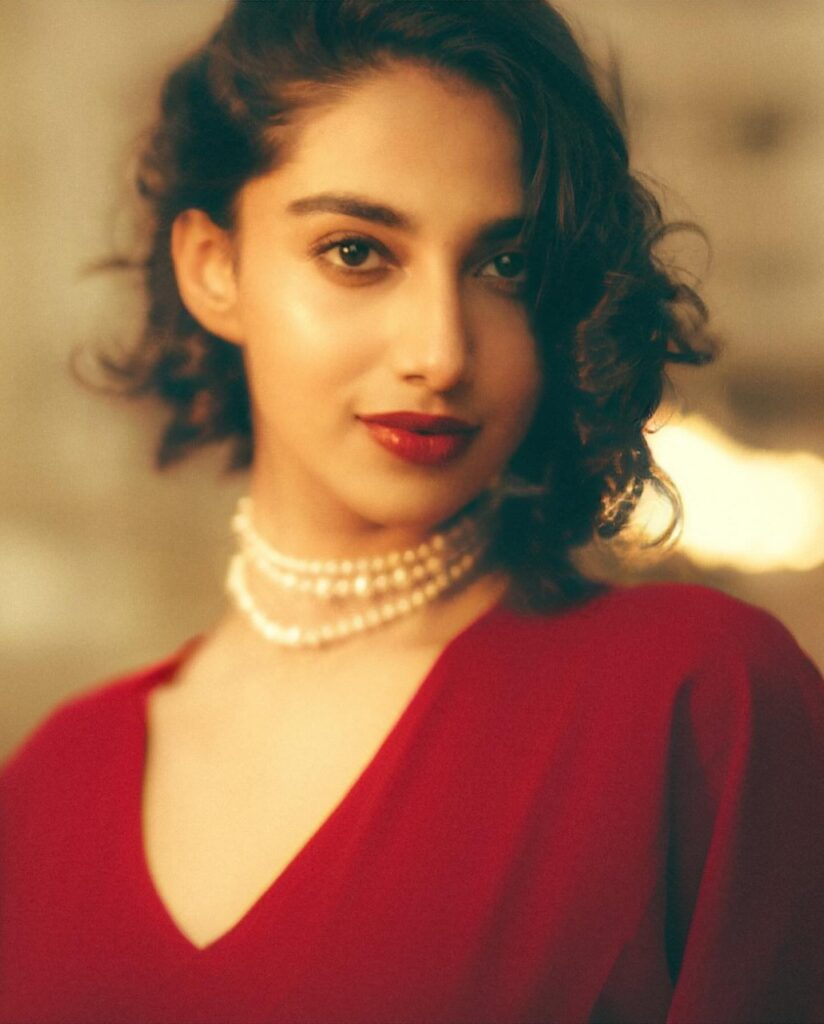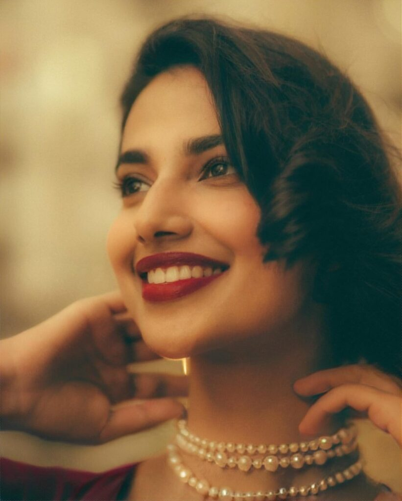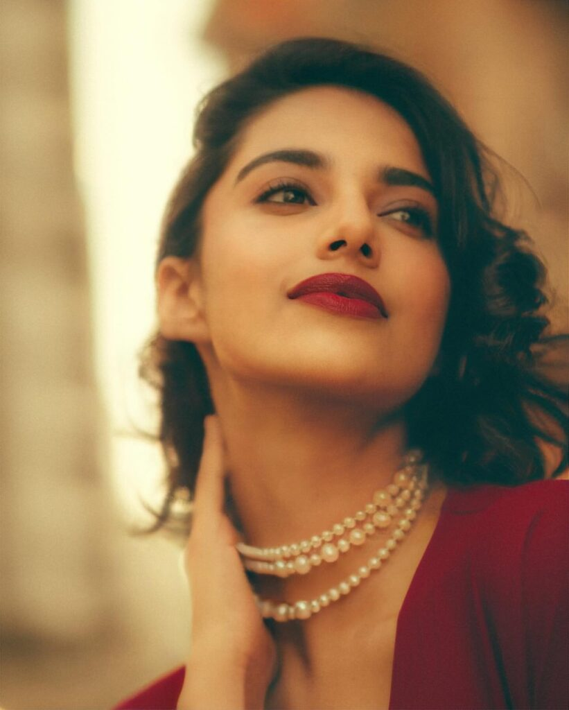 In her most recent instagram post, Meenakshi Chaudhary serves up some sizzling realness! The actress looks stunning in a flowing crimson gown that glides down her body, expressing elegance and grace. The plunging neckline exudes charm, while the dainty pearl necklace adds refinement.