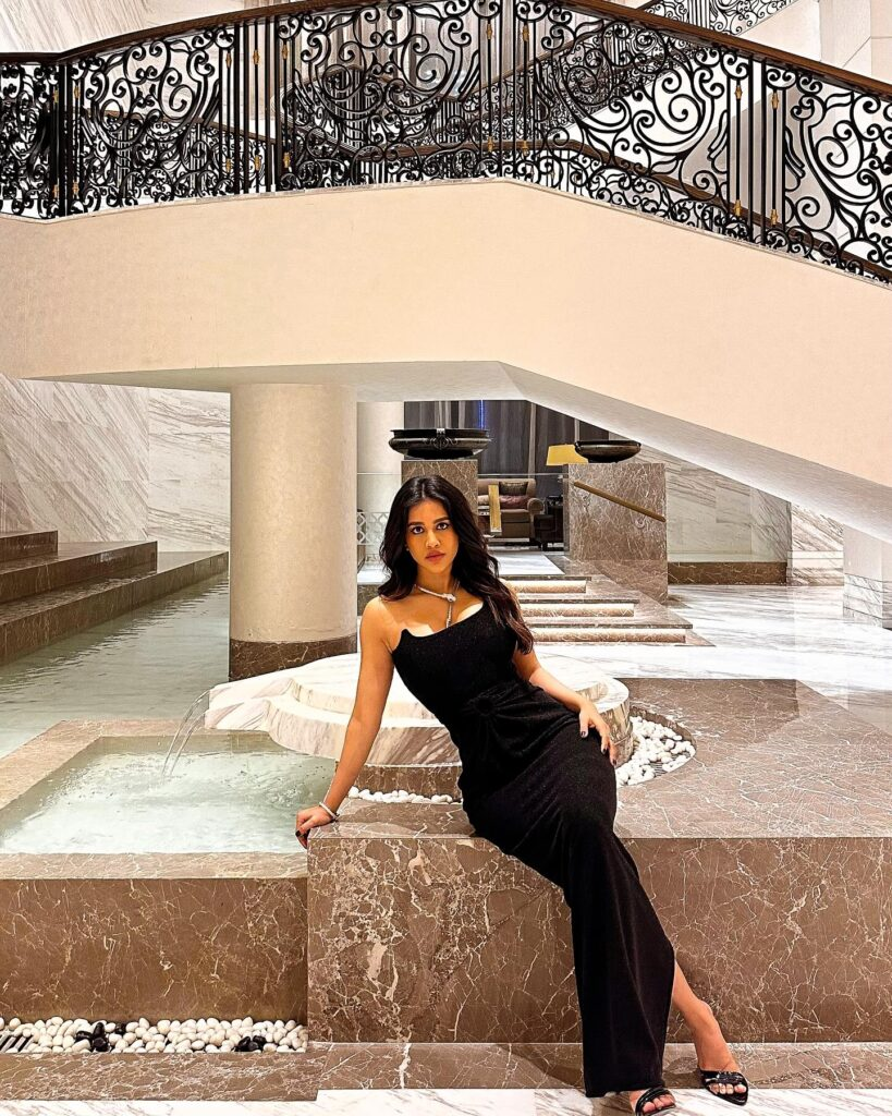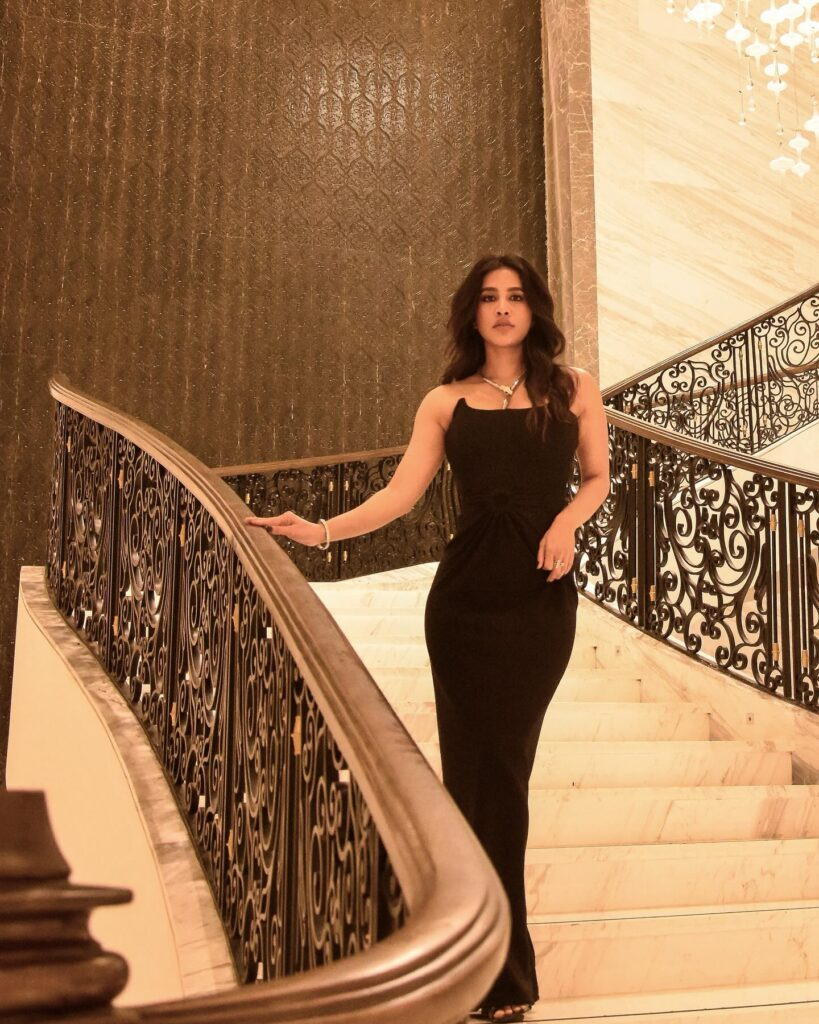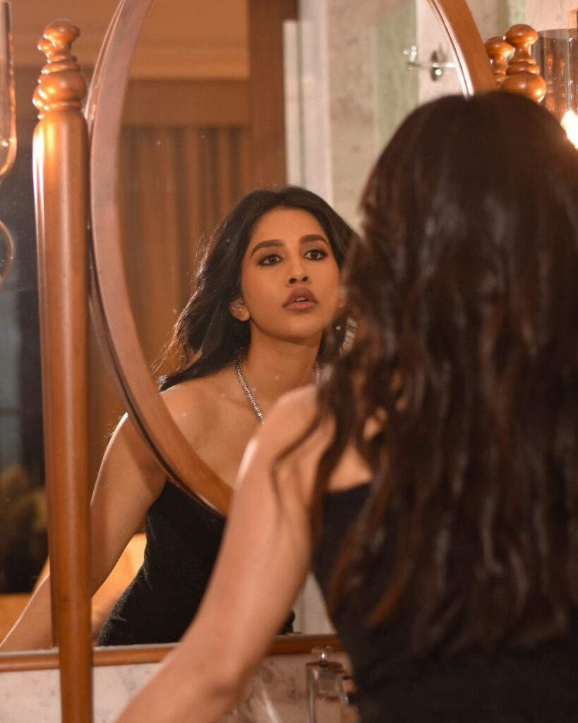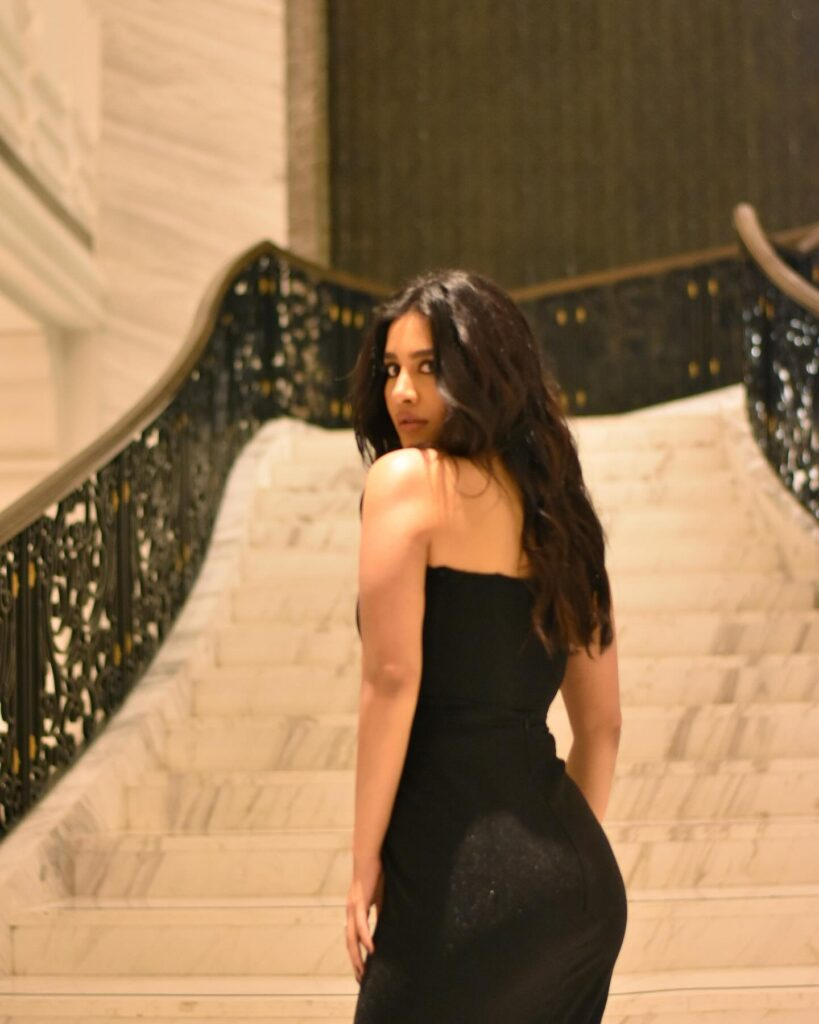 Nabha Natesh exuded oomph in a recent photoshoot, and the internet went crazy! The actress wore a black thigh-high slit dress that highlighted her curves well. The strong look was accentuated with flaming red lipstick and dramatic black winged mascara. Natesh styled her hair loosely in cascading waves, adding to the attraction. This photograph demonstrates her ability to conquer both casual and fancy styles with easy style. Nabha is someone to keep an eye on in the fashion industry!