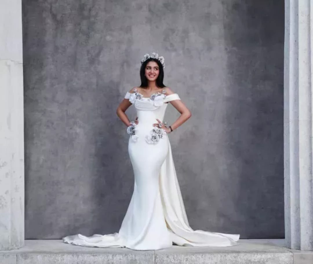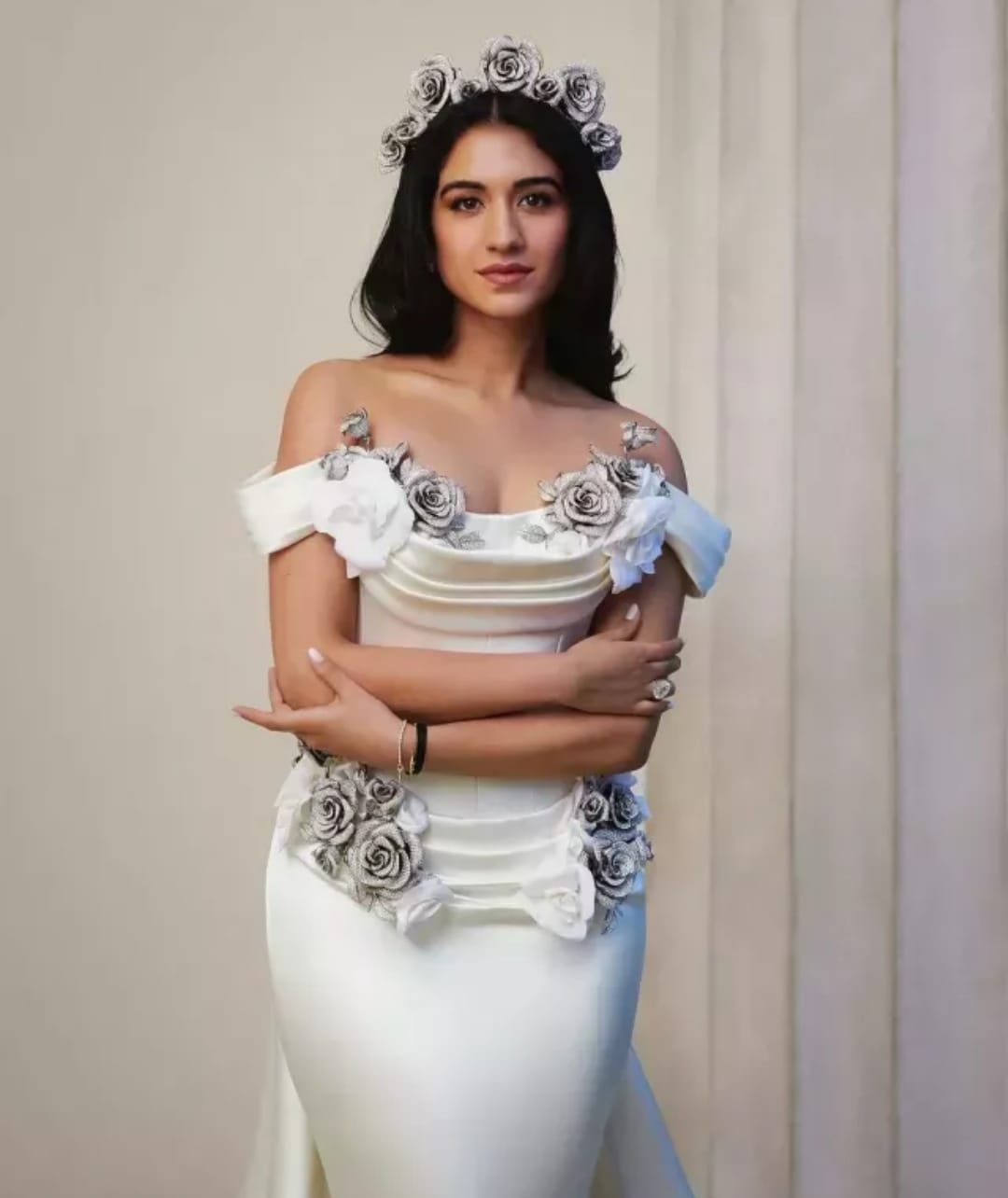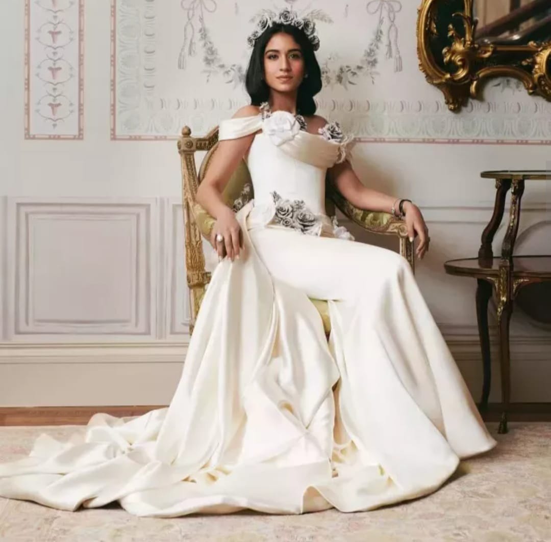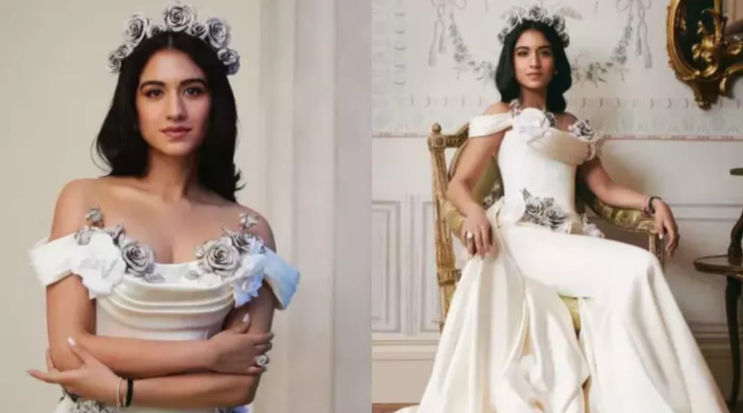 Radhika Merchant looked stunning in a white gown by 'Tamara Ralph', rose accessory caught her attention