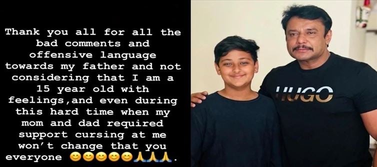 తాజాగా దర్శన్ కుమారుడు తన తండ్రి పైన జరుగుతున్న ప్రచారం పైన స్పందిస్తూ సోషల్ మీడియా వేదికగా ఒక పోస్ట్ ని షేర్ చేయడం జరిగింది. దర్శన్ కొడుకు పేరు వినిష్ తూగూది తన తండ్రి దర్శన్ తో పాటు తల్లి విజయలక్ష్మి కి కూడా మానసికంగా ప్రశాంతత ఇప్పుడు అవసరమంటూ తెలియజేశారు.తన తండ్రిని బూతులతో దూషిస్తూ చేస్తున్న వారందరికీ కృతజ్ఞతలు అంటూ చెప్పుకోచ్చారు.. తన తండ్రి హత్య చేసి ఉంటాడని తాను నమ్మడం లేదంటూ అని కూడా తెలియజేశారు.