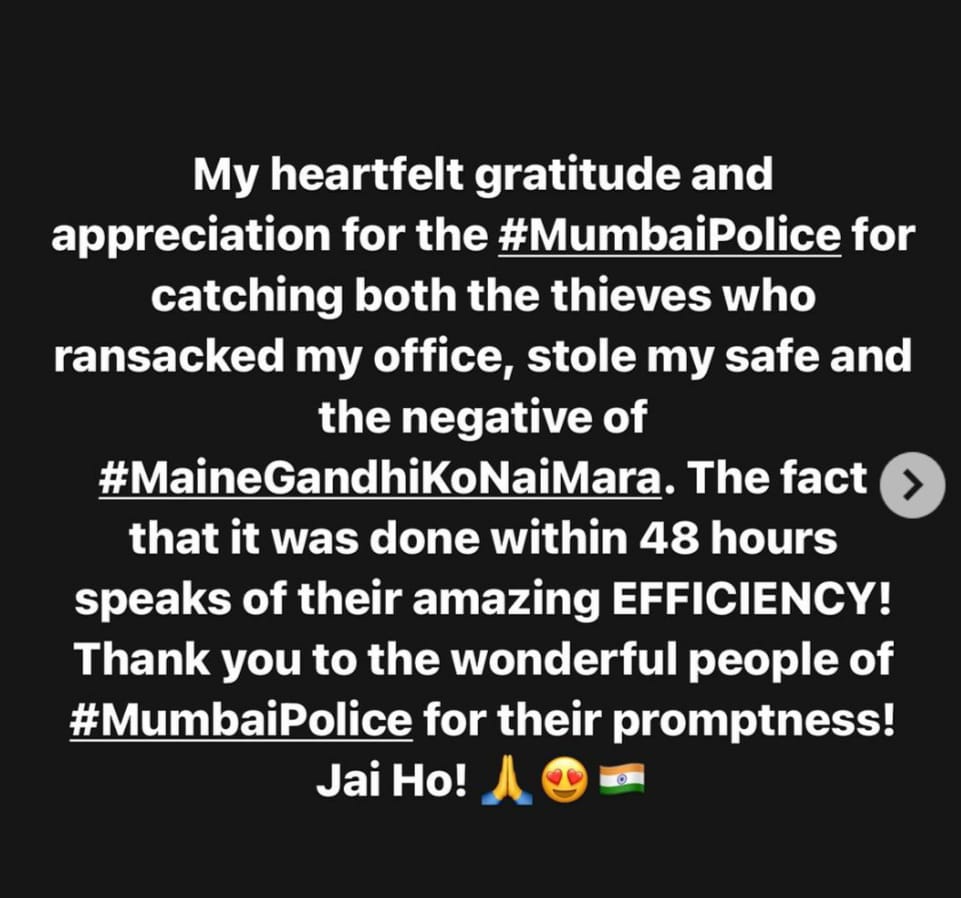 Anupam Kher's note read, "My heartfelt gratitude and appreciation for the mumbai police for catching both the thieves who ransacked my office, stole my safe and the negative of #MaineGandhiKoNaiMara. The fact that it was done within 48 hours speaks of their amazing efficiency!! jai Ho! (Folded hands, heart eyes, and National Flag emojis)."