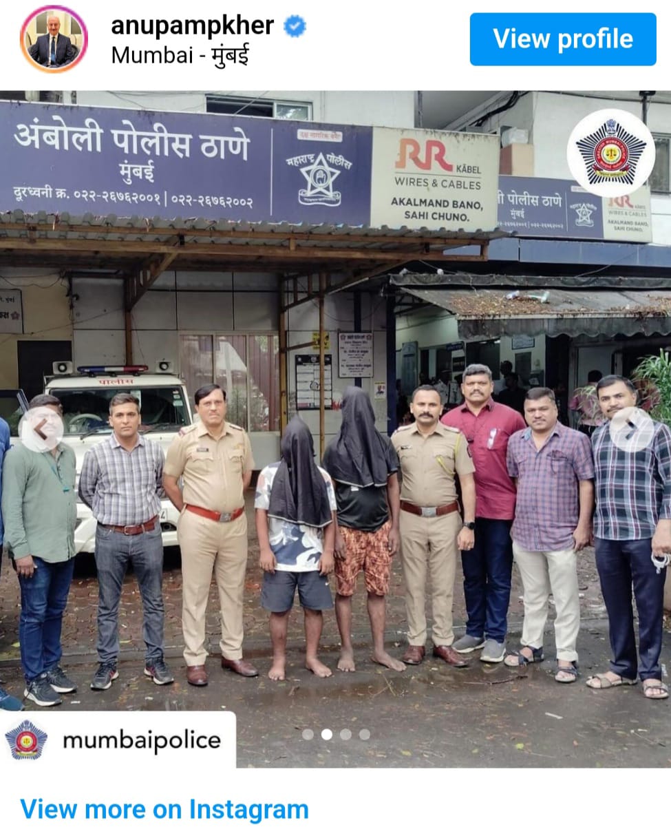 Actor anupam kher expressed his gratitude to the mumbai police for apprehending the thieves who had stolen from his office. On Sunday, he shared a note on Instagram, accompanied by a picture of the thieves along with the police and screenshots of his and the police's social media posts.