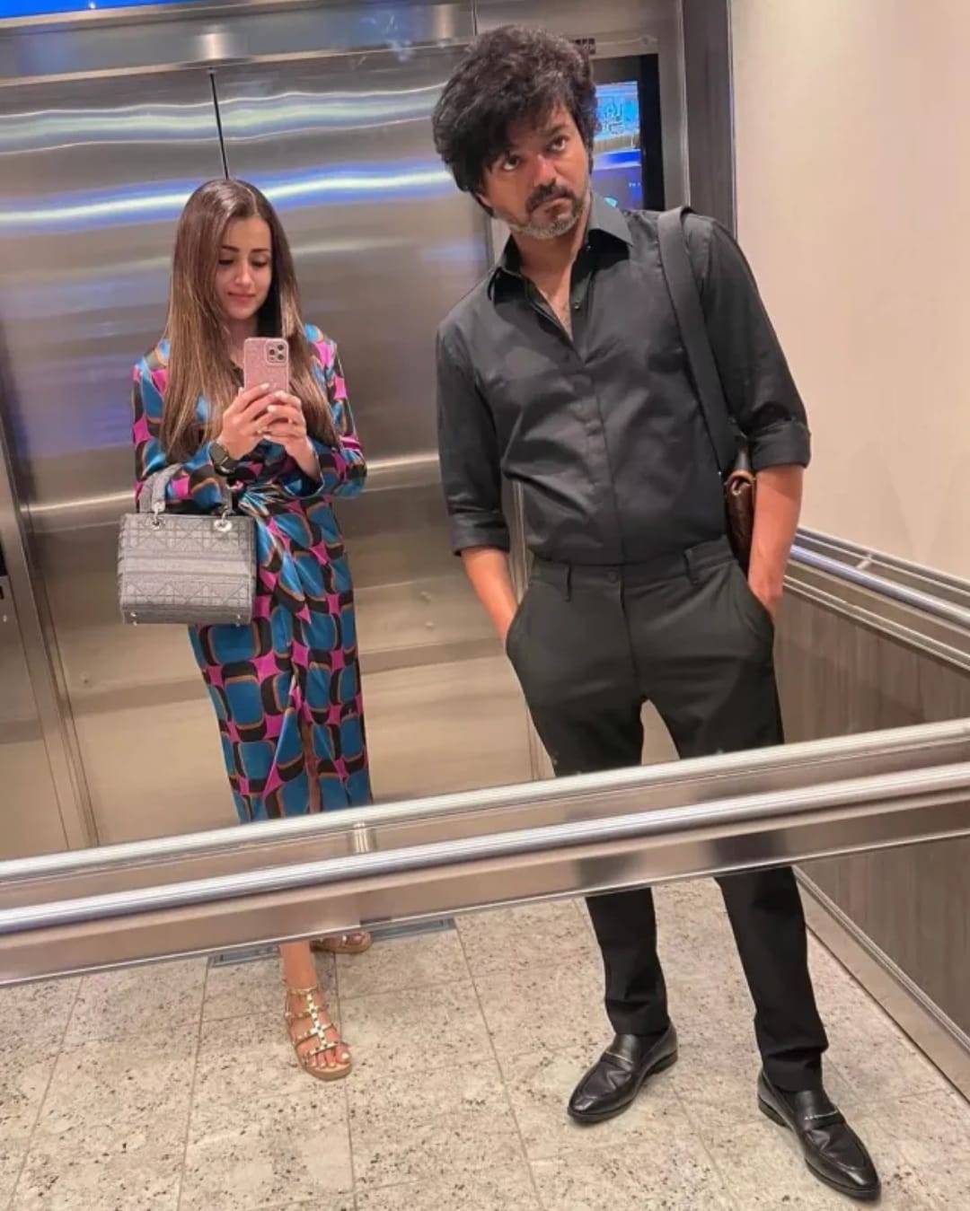 Trisha shared a photo from her insta handle to wish Vijay on his birthday, in which she was seen in a lift with the birthday boy. While trisha looked good in a printed maxi dress, Vijay looked dashing in an all-black look. In the caption of this post, the actress also wrote a loving birthday wish, which can be read as, "Shanti se toofaan, toofaan se shanti! Many more milestones ahead." Along with this, trisha also dropped heart, infinity, and evil eye emojis.
