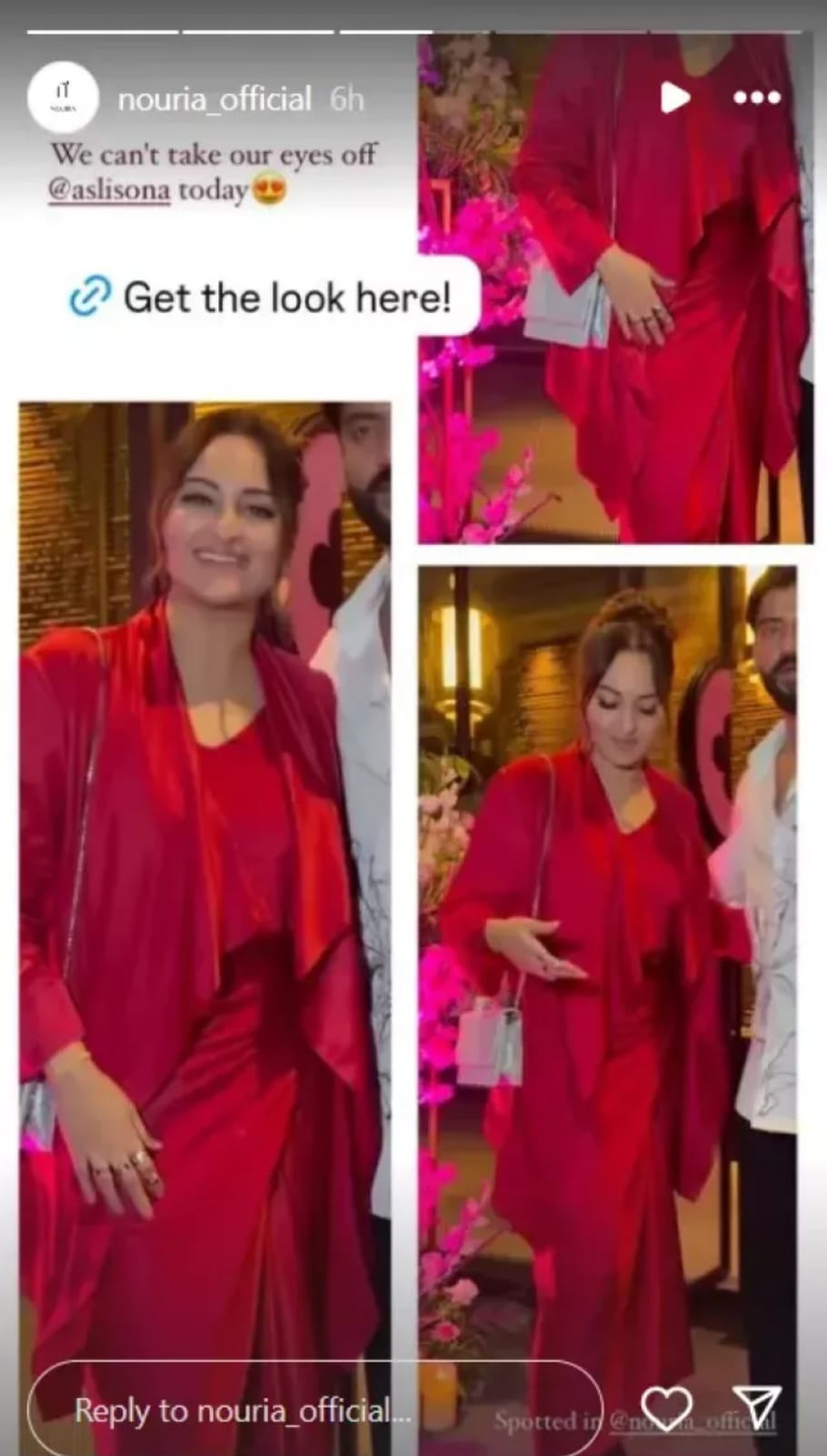 For her dinner date, Sonakshi wore a red dress, giving off newly wed bride vibes and she looked absolutely beautiful. The actress looked stunning with soft makeup and hair tied in a bun. After a little research, we found out that the actress' outfit was from the collection of the brand 'Nuria' and this satin co-ord set is priced at Rs 18,999.