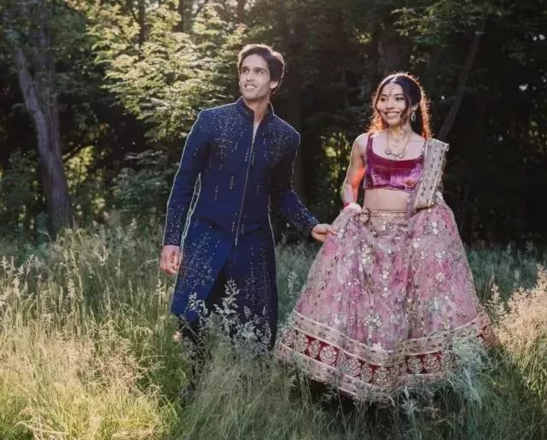On June 25, 2024, Sidharth shared special glimpses of his indian wedding with Jasmin. The couple can be seen posing merrily in front of the beautiful backdrop of nature. Talking about the bride, she looked gorgeous in a maroon-toned velvet lehenga that featured intricate 3D floral motifs. She paired it with a strappy choli and a sheer dupatta. On the other hand, Sidharth wore a blue sherwani, styled with matching pajamas. Along with the pictures, he wrote, "Indian wedding dresses are something special..."