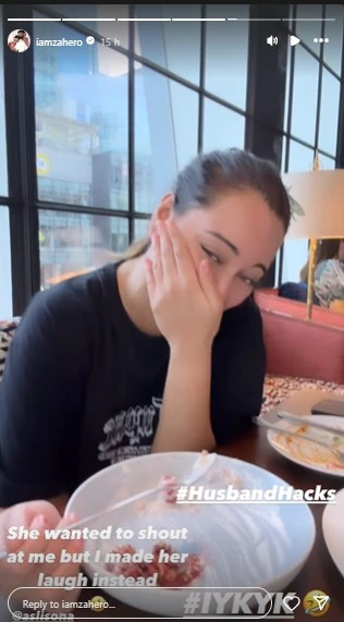 "She wanted to shout at me, but I made her laugh instead," Zaheer stated after posting the footage to his instagram story. #IYKYK. Sonakshi shared the video again with the comment, "Guts." Along with that, the pair posted a mirror selfie with the comment, "What a beautiful day."