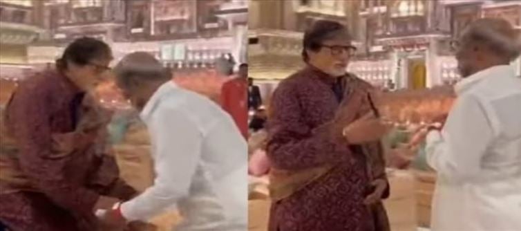 Veteran actors amitabh bachchan and Rajinikanth attended the shubh Aashirwad ceremony of Anant Ambani and radhika Merchant on Saturday. A video has surfaced showing Amitabh's reaction when Rajinikanth attempted to touch his feet.