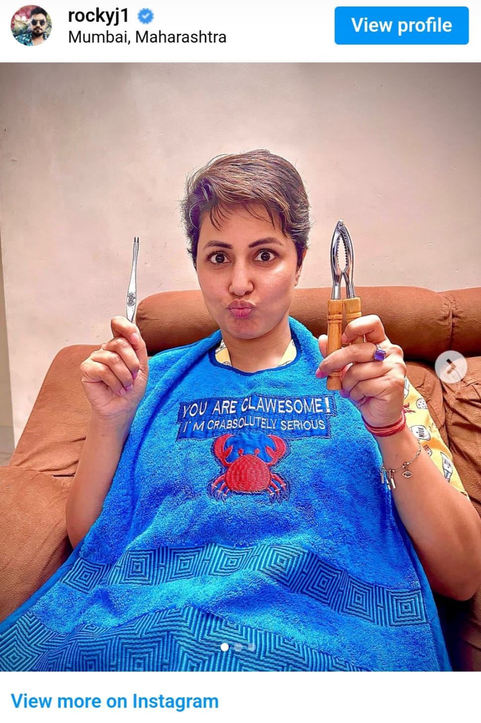 Rocky penned an emotional post for Hina and pampered her with a special meal that he cooked himself. He posted a bunch of photos of the ‘Yeh Rishta Kya Kehlata Hai’ actor on Instagram. In the pictures, she was seen wearing a blue apron and holding a crab cracker and a spoon.