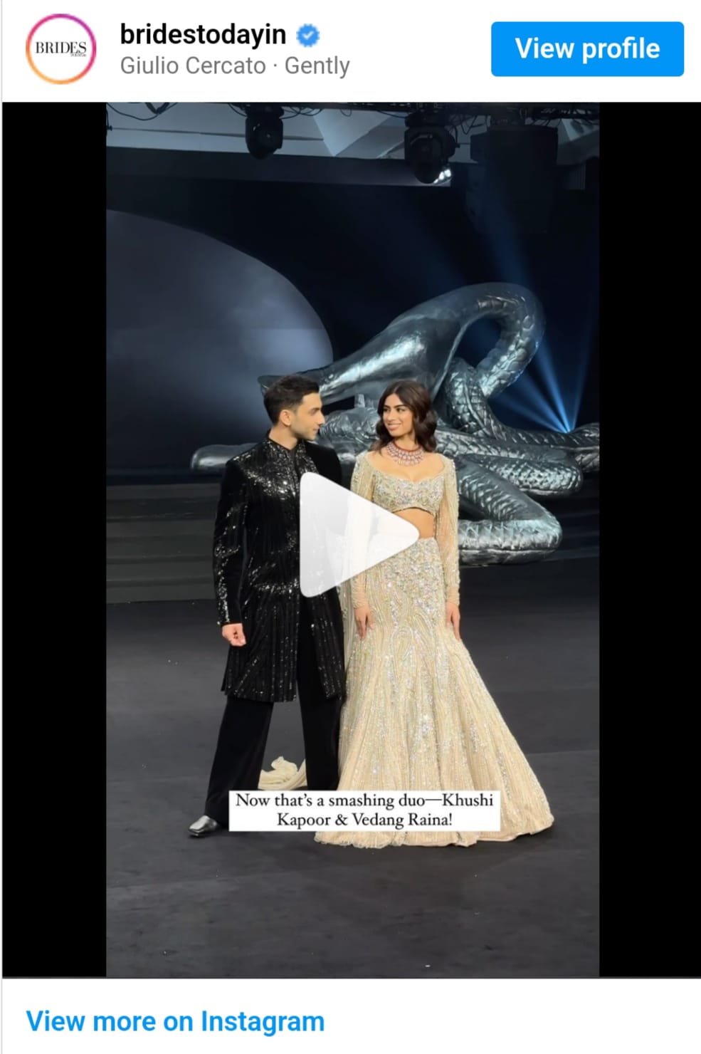 To complement Khushi's outfit, Vedang opted for a jet-black sherwani embellished with beadwork. As per the news 18 report, he said, "Gaurav’s visionary artistry is unparalleled. His ability to transform fabric into wearable art is extraordinary. I am thrilled to be a part of his vision and this collection"