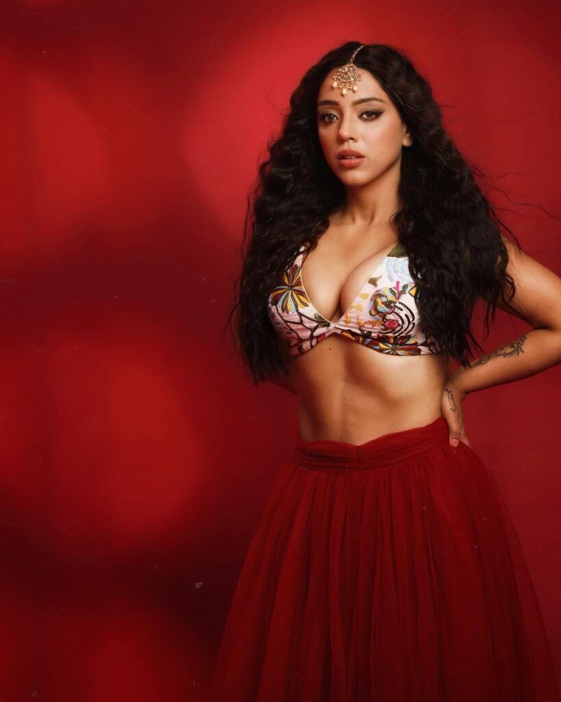Deviyani has a new weapon in her wardrobe: the lehenga! Say goodbye to monokinis! Deviyani, who is well-known for her daring appearances and tiny swimwear, is a shocking admirer with a gorgeous change from her typical image. This time, she's wearing an opulent maroon lehenga that flawlessly accentuates her contours. The low-cut bralette with its striking maroon and white accents provides a contemporary touch, while the rich colour pops against her skin tone. Deviyani completes the look with loose locks that fall over her shoulders and frame her face as she confidently bares her cleavage.