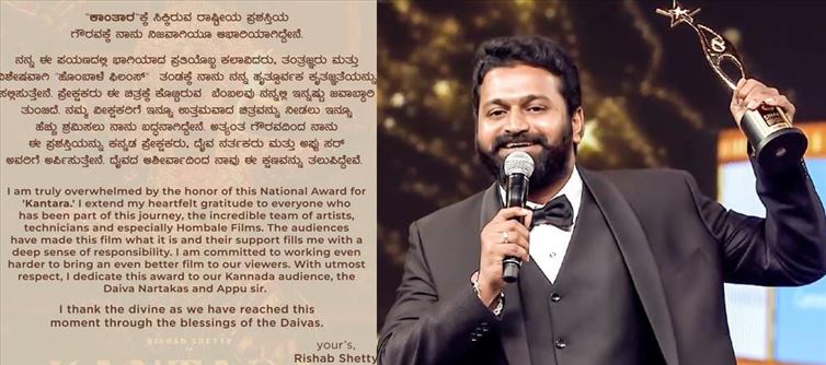 జాతీయ చలనచిత్ర అవార్డులను శుక్రవారం అనౌన్స్ చేసిన విషయం తెలిసిందే. మరి ఇందులో ఉత్తమ నటుడిగా ప్రముఖ కన్నడ నటుడు రిషబ్ శెట్టి తన మైండ్ బ్లోయింగ్ పెర్ఫార్మన్స్ కి గాను కాంతారా చిత్రానికి అవార్డును అందుకున్నారు. దీంతో ఆ అవార్డుకు తను తగినవాడే అంటూ అందరూ ప్రశంసలు కురిపించారు. మరి లేటెస్ట్ గా ఈ అవార్డు గెలిచిన తర్వాత రిషబ్ ఒక ఎమోషనల్ నోట్ విడుదల చేశారు. తను జాతీయ అవార్డు గెలుచుకోవడం ఎంతో ఆనందంగా భావిస్తున్నాను అని అలాగే తనతో ఈ ప్రయాణంలో భాగం అయిన అందరికి ధన్యవాదాలు తెలుపుతున్నాను అంటూ తెలిపారు. అలాగే తనకి వచ్చిన ఈ అవార్డును తన రాష్ట్రంలో దేవ నర్తకులకి అలాగే దివంగత హీరో పవర్ స్టార్ పునీత్ రాజ్ కుమార్ గారికి అంకితం చేస్తున్నాను అంటూ తెలిపారు. ఇప్పుడు తన ఎమోషనల్ పోస్ట్ సోషల్ మీడియాలో వైరల్ అవుతుంది.సెప్టెంబర్ 30న కర్ణాటక రాష్ట్రంలో 250 థియేటర్లలో విడుదలై కాంతారా మూవీ సృష్టించిన సంచలనాలు అన్నీఇన్నీ కావు. ఆ తర్వాత ఇతర భాషల్లో కాంతారా మూవీ డబ్ అయ్యి ఇతర భాషల్లో సైతం హిట్ గా నిలిచింది. కేవలం రూ.16 కోట్ల బడ్జెట్ తో తెరకెక్కిన ఈ సినిమా రూ.300 కోట్లకు పైగా గ్రాస్ కలెక్షన్లను సొంతం చేసుకుంది అంటే ఈ సినిమా ప్రేక్షకులకు ఏ స్థాయిలో నచ్చిందో అర్థం చేసుకోవచ్చు. రిషబ్ శెట్టి స్వీయ దర్శకత్వంలో తెరకెక్కిన ఈ సినిమా అభిమానులకు బాగా నచ్చింది. కేంద్రం 70వ జాతీయ చలనచిత్ర పురస్కారాలను ప్రకటించగా ఉత్తమ నటుడి పురస్కారం కాంతారా సినిమాకు గాను రిషబ్ శెట్టికి దక్కింది. రిషబ్ శెట్టికి జాతీయ అవార్డు దక్కడం సినీ అభిమానులకు ఎంతో సంతోషాన్ని కలిగించింది.