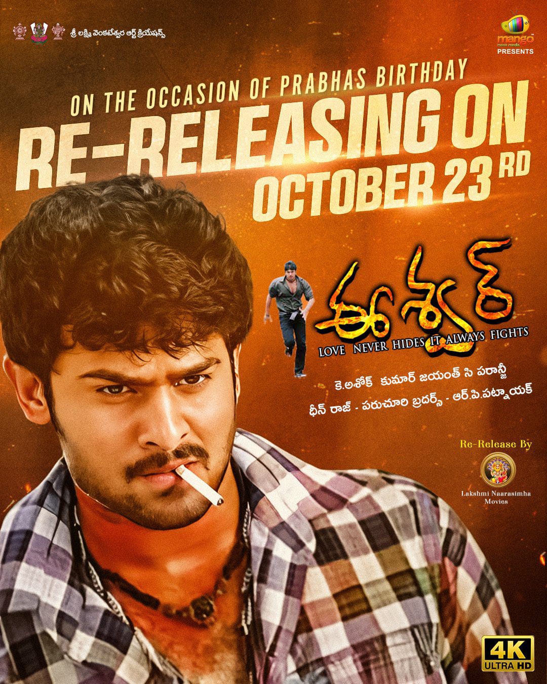 ఇకపోతే మంచి అంచనాల నడుమ విడుదల అయిన ఈ సినిమా బాక్స్ ఆఫీస్ దగ్గర పర్వాలేదు అనే స్థాయి విజయాన్ని అందుకుంది. ఈ మూవీ తో ప్రభాస్ కి మంచి గుర్తింపు తెలుగు సినీ పరిశ్రమలో లభించింది. ఇకపోతే ఈ సినిమాను తిరిగి మళ్లీ థియేటర్ లలో రీ రిలీస్ చేయబోతున్నారు. తాజాగా అందుకు సంబంధించిన అధికారిక ప్రకటన కూడా వెలువడింది. ఇకపోతే ఈ సంవత్సరం ప్రభాస్ పుట్టిన రోజు సందర్భంగా అక్టోబర్ 23 వ తేదీన ఈశ్వర్ మూవీ ని రీ రిలీజ్ చేయనున్నట్లు ఈ మూవీ బృందం వారు తాజాగా అధికారికంగా ప్రకటిస్తూ ఓ పోస్టర్ ను కూడా విడుదల చేశారు.