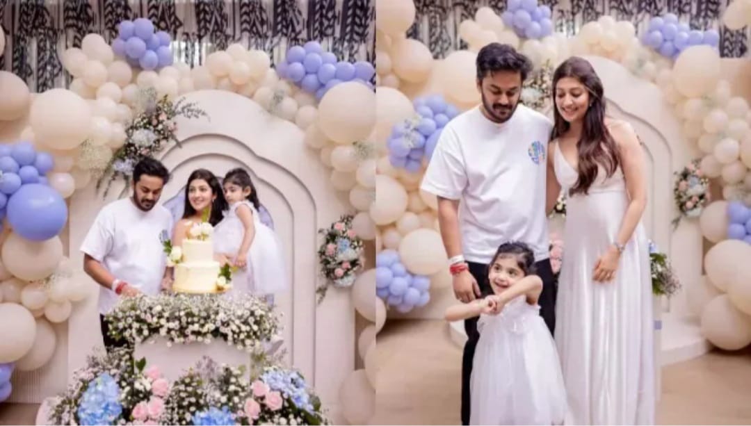 Pranitha's husband Nithin and his family hosted a baby shower party for the 'mom-to-be'. The mother-to-be looked gorgeous in a white strappy maxi dress at the bash. Pranitha kept her makeup light and her hair was half-tied at the back. Her daughter, on the other hand, wore a matching white dress with a butterfly on the yoke. Her husband also twinned with her in a white t-shirt and black trousers.