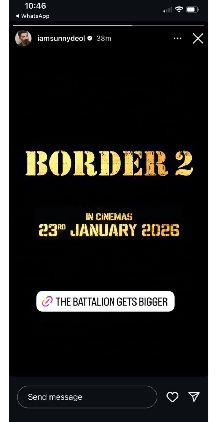 Since the announcement of 'Border 2', fans are eagerly waiting for its release in theaters. Sunny Deol, who is playing an important role in this film, has shared a post on his instagram story and announced the release date of 'Border 2'. It is written in the post, "' Border 2' will be released in theaters on 23 january 2026." That is, this film will hit the theaters on the occasion of Republic Day. At the same time, the announcement of the release date of the film has now made the excitement of the fans at the peak level.
