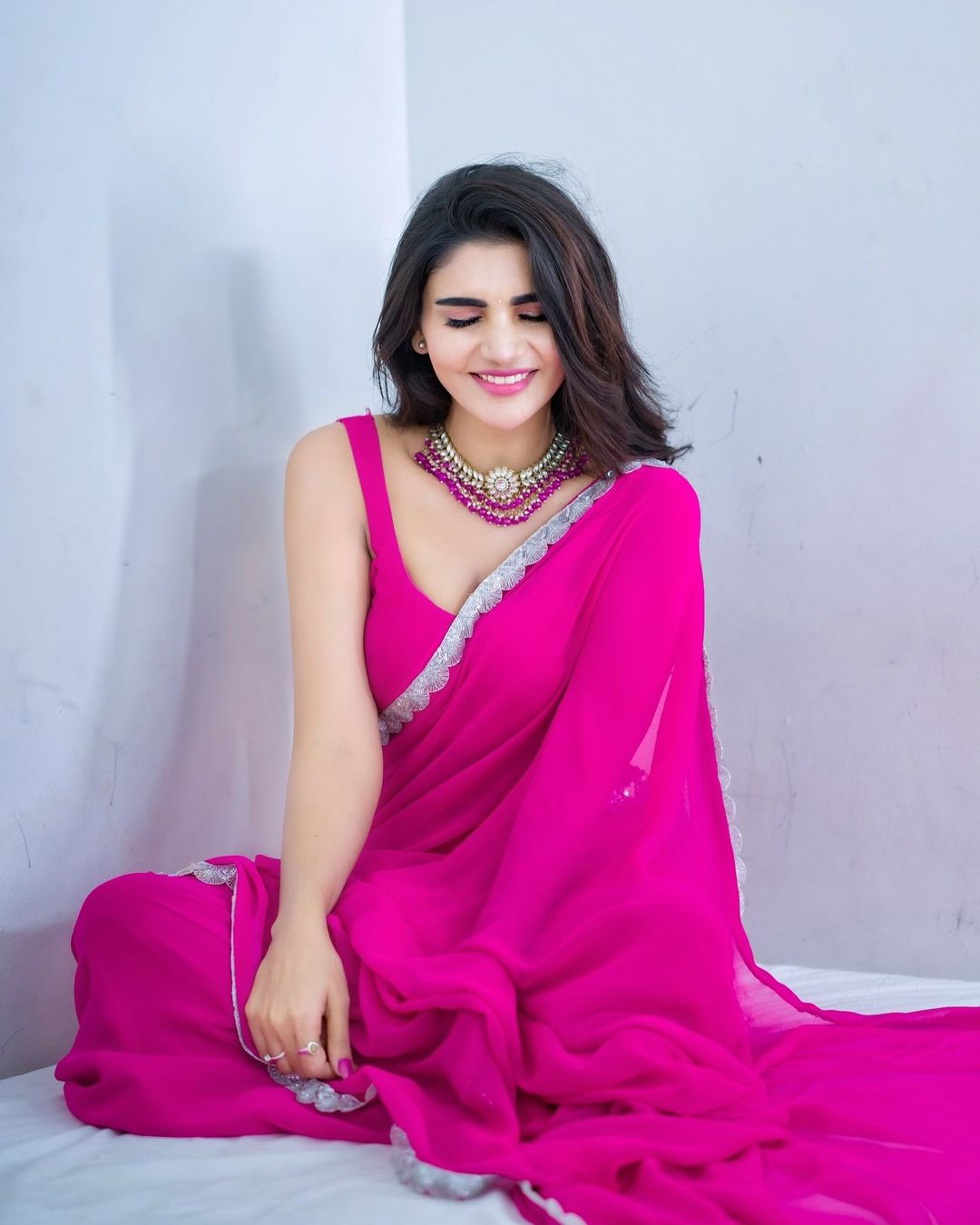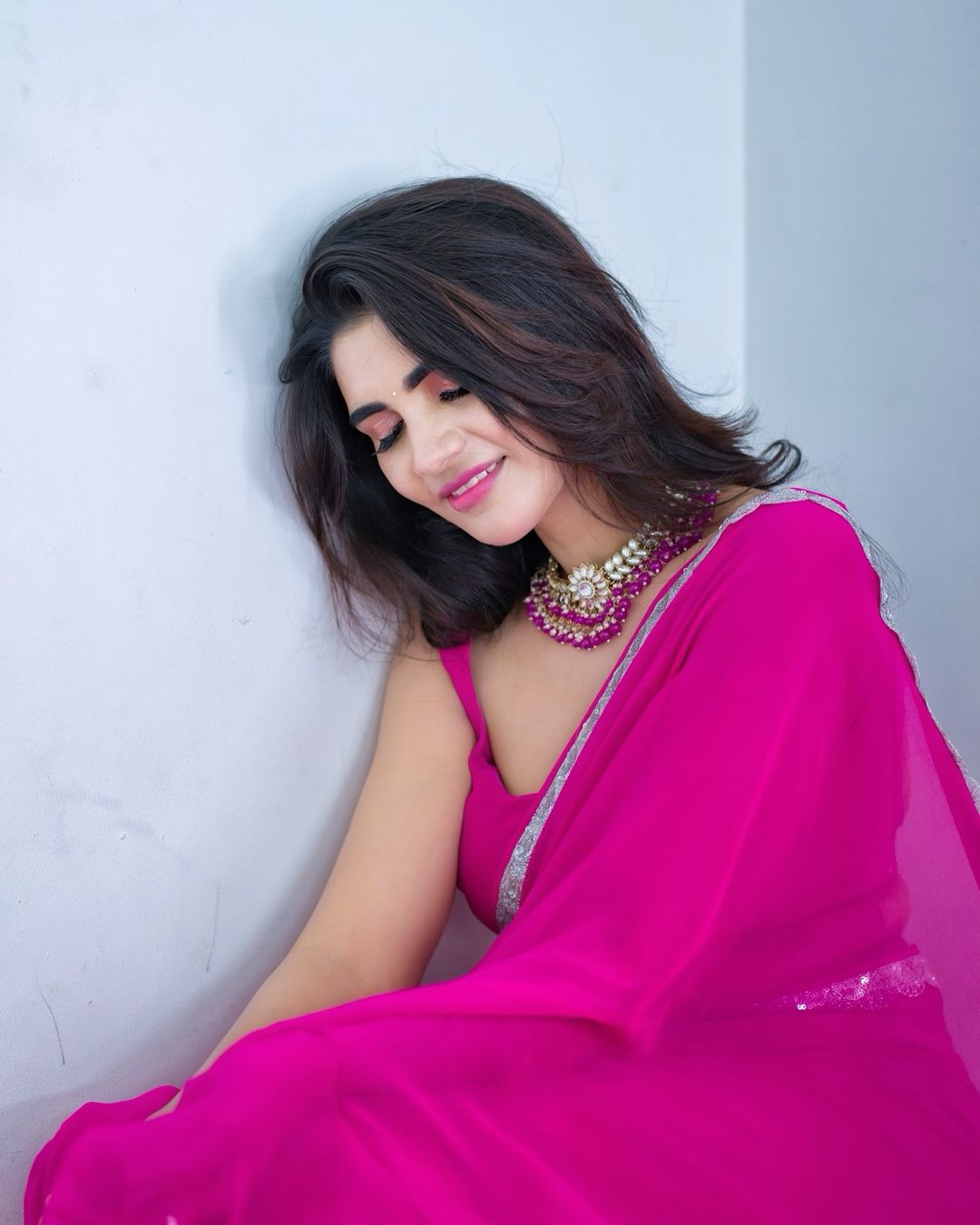 స్మాల్ స్క్రీన్ నటి అయినప్పటికీ ఈ తార స్టార్ హీరోయిన్లకు ఏమాత్రం తీసుపోని విధంగా తన చూపిస్తుంది. తాజాగా ఈ ముద్దుగుమ్మ ఇంక కలర్ ఆఫ్ శారీలో దిగిన ఫోటోలు షేర్ చేసింది అందులో ఈ ముద్దుగుమ్మ చాలా అట్రాక్టివ్‌గా కనిపించింది. స్లీవ్ లెస్ జాకెట్ వేసుకొని తన బ్యూటిఫుల్ స్కిన్ ఎక్స్‌పోజ్ చేసింది. అంతే కాదు ఎద అందాలను కూడా చూపించింది. చాలా ముద్దుగా నవ్వుతూ అందరినీ కట్టిపడేసింది. మెడలో కూడా గులాబీ రంగు నెక్లెస్ వేసుకుంది. చాలా హాట్ గా పూజలు ఇస్తూ కైపెక్కించింది. ఇంక లిప్‌ స్టిక్ తో ఆమె పెదవులు చాలా హాట్ గా తయారయ్యాయి. అందమైన కళ్ళను చూసి చాలామంది ఫ్లాట్ అవుతున్నారు. అంతా పింక్ మాయంతో ఈ బార్బీ డాల్ లా కనిపించింది.