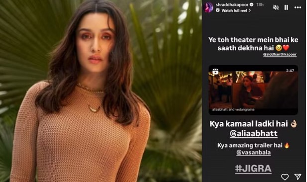 Recently the teaser of Jigra was released. The teaser of the film shared by alia and Vedang Raina was re-posted by Shraddha Kapoor on her instagram story. Sharing it, he wrote, "This is to be seen in the theater with brother." He also tagged his brother Siddhanth Kapoor in this post. Tagging alia bhatt, he wrote, "What a wonderful girl. At the same time, tagging Vedang, he wrote, what a wonderful trailer. He also added the hashtag of Jigra in this post. In response to this post, Alia also praised Shraddha on her instagram story and said, "Hahaha thank you my blockbuster Stree."