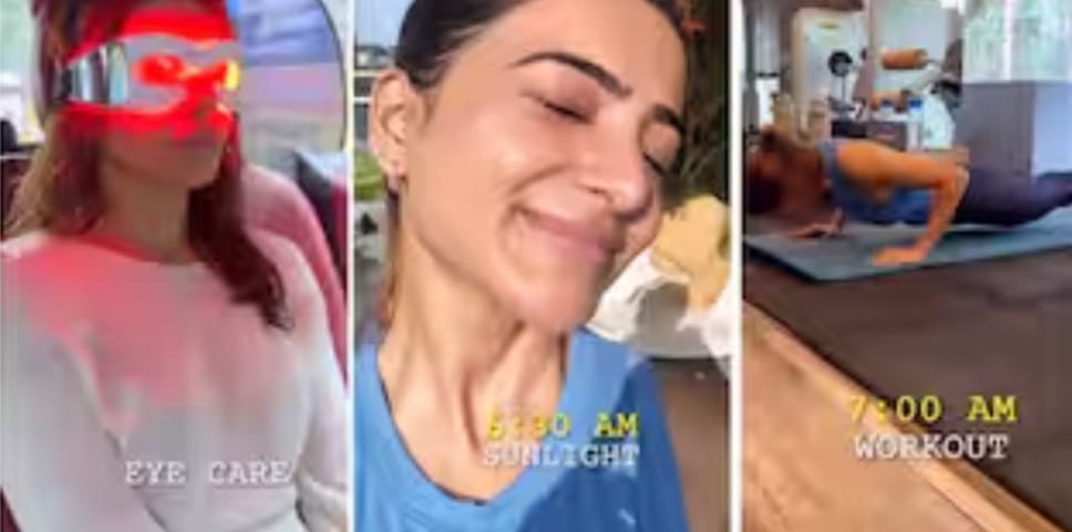 The first thing written in the video is a day of my life... samantha takes sunlight at 6.30 in the morning. After this she does oil pulling. At 7 o'clock samantha works out. At 8 o'clock she worships and thanks God. After this, she takes therapy to keep her eyes healthy. She reaches the set at 9 o'clock and works till 5.30 pm. After this, she reaches for red light therapy at 6 pm. She plays pickleball at 7 pm. She meditates at 9.30 pm and goes to sleep at 10 pm.