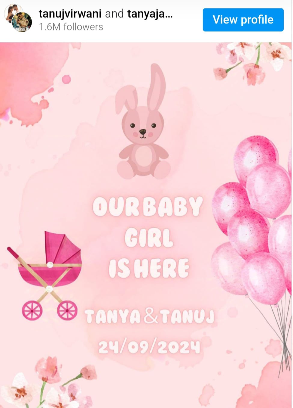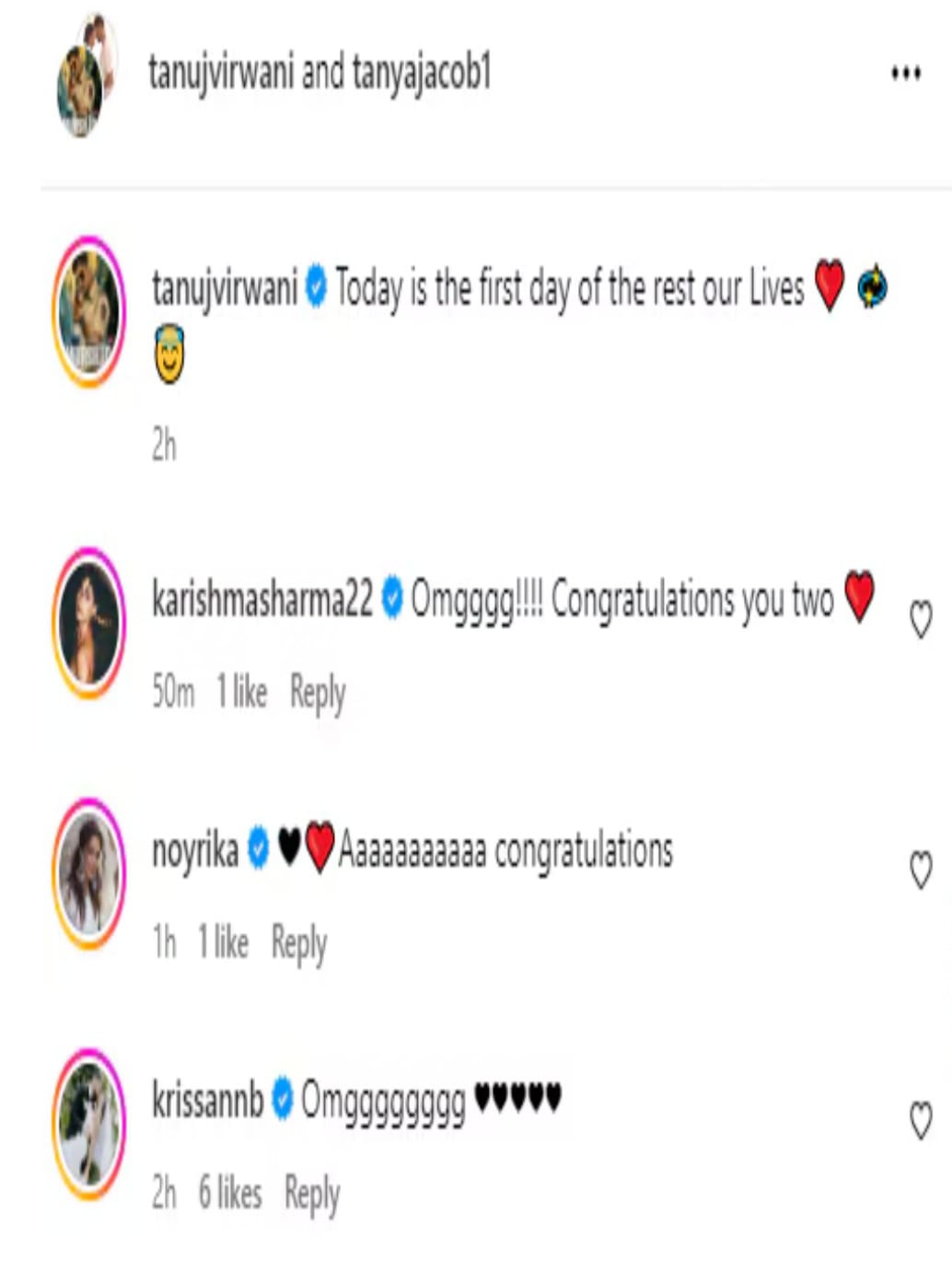 .Along with fans, celebs are also congratulating tanuj virwani and tanya Jacob on becoming parents on social media. Actress and model Karishma Sharma has commented that, 'Oh my God. Congratulations to both of you.' 'Kaisi Hai Yeh Yaariyan' actress Krisann Barretto wrote with a heart emoji, 'Oh my God.' Actress Noirika Bhateja wrote congratulations with a red heart emoji.