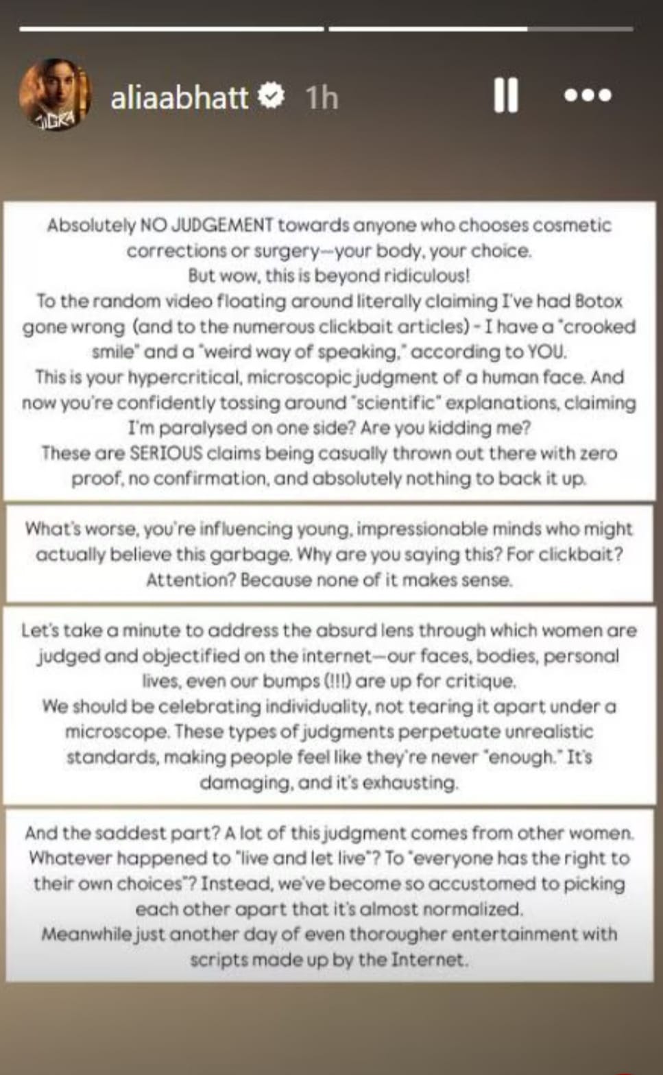 Bollywood actress alia bhatt has slammed everyone claiming that she’s had “botox gone wrong” and is “paralyzed on one side,” calling these statements baseless and damaging.