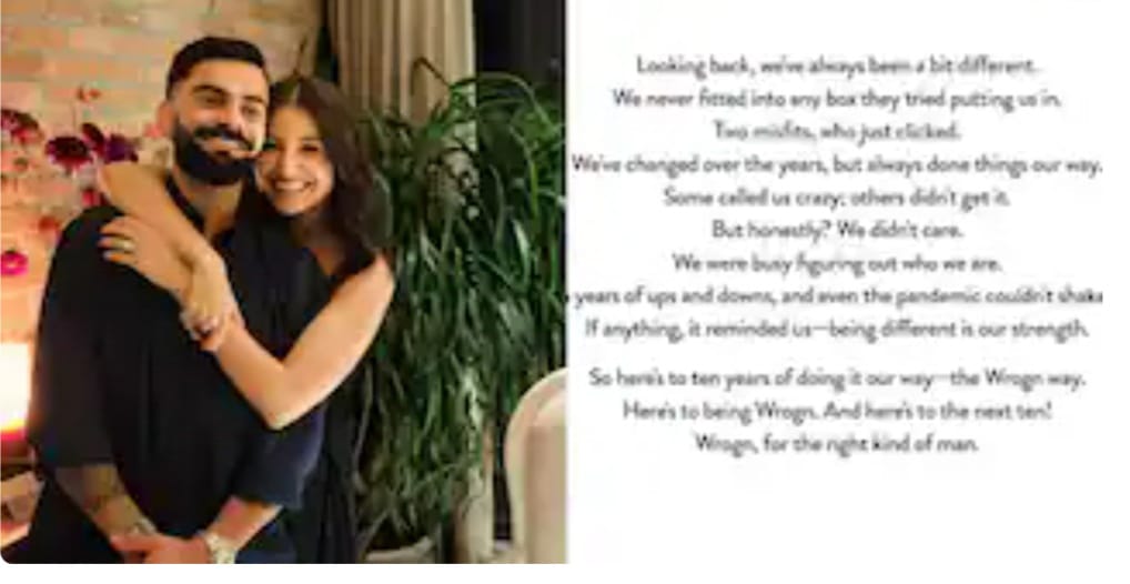 Virat further wrote - But honestly? We didn't care. We were busy figuring out who we were. Ten years of ups and downs, and even a pandemic couldn't shake us. If anything, it reminded us - being different is our strength. So here's to ten years of doing it our way - the Wrogn way. Here's to being Wrogn and here's to the next ten! For the wrong, right kind of man.