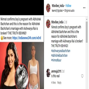 అయితే కొంతమంది మాత్రం దీన్ని కొట్టి పారేస్తున్నారు.ఎందుకంటే.. మన ఇండియాలో లింగ నిర్ధారణ పరీక్ష చేయడం అనేది నిషేధం. అలాంటిది నిమ్రత్ కౌర్  ప్రెగ్నెంట్ అయితే ఇండియాలో ఎలా లింగ నిర్ధారణ పరీక్ష చేసి మగ బిడ్డ అని చెప్పారు. ఇదంతా ఫేక్ న్యూస్..వట్టి రూమర్స్ మాత్రమే.. దీన్ని ఎవరూ నమ్మకండి అంటూ అభిషేక్ బచ్చన్ ఐశ్వర్య రాయ్ అభిమానులు రీ పోస్టులు పెడుతున్నారు. మరి సోషల్ మీడియాలో సంచలనం సృష్టిస్తున్న ఈ పోస్టు గురించి అభిషేక్ బచ్చన్,నిమ్రత్ కౌర్ లు ఏ విధంగా రియాక్ట్ అవుతారో చూడాలి