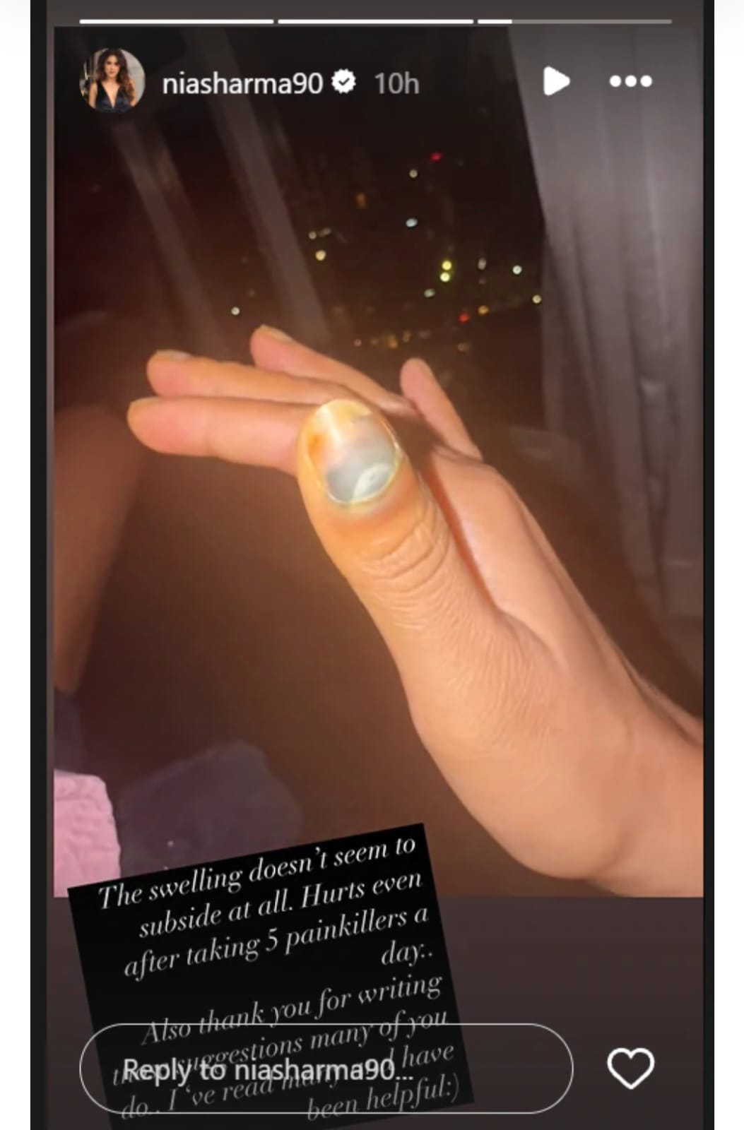 Nia Sharma Injury: Television star Nia Sharma is troubled by a small injury. The pain in the thumb of the hand is unbearable. For relief, she is taking 5 painkillers a day. Nia shared a glimpse of her thumb on instagram Stories, which is swollen and blue. Along with this, she also told the pain of painkillers.