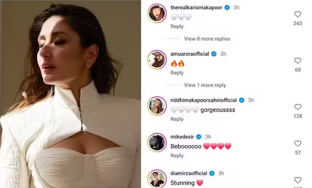 As soon as Kareena shared her post, many stars started reacting. ananya Panday instantly liked the post, karisma kapoor made several white hearts, sonam kapoor wrote with a red heart emoji, "Wow!" Her best friend amrita arora made fire emojis, dia mirza wrote "Stunning" and Riddhima Kapoor Sahni made several white heart emojis and called her "Gorgeous".